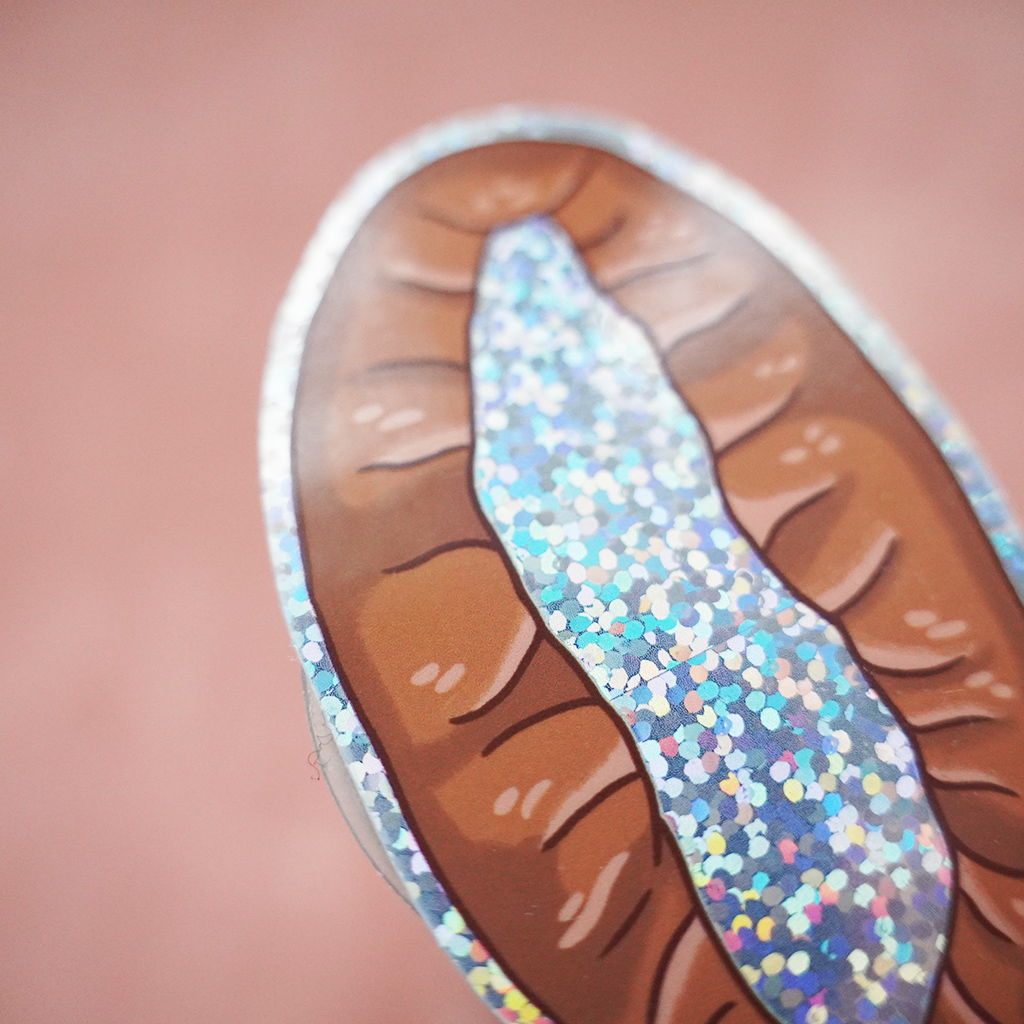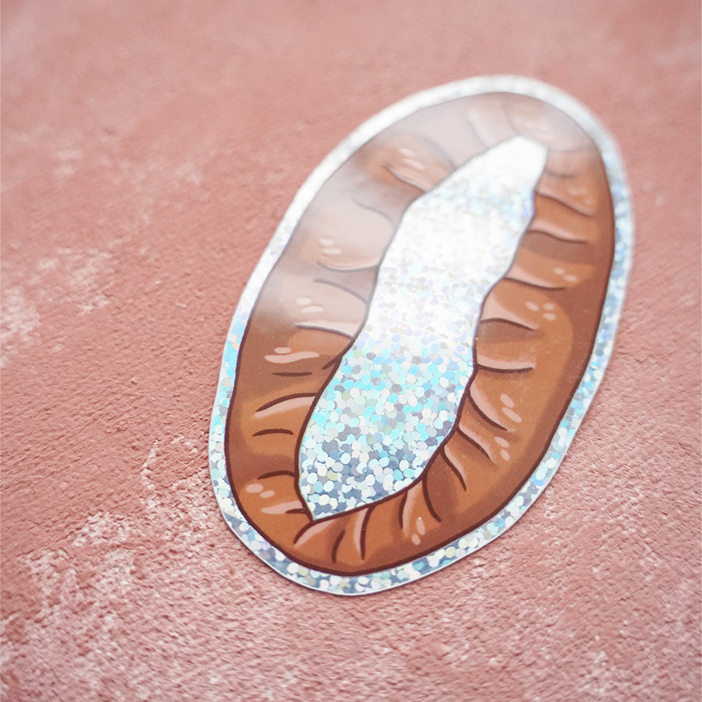 Säihkyvän kimalteleva bile-karjalanpiirakka tuo perinneherkun uuteen loistoonsa! Laadukas tarra sopii erinomaisesti läppäriin, juomapulloon tai kalenteriin.