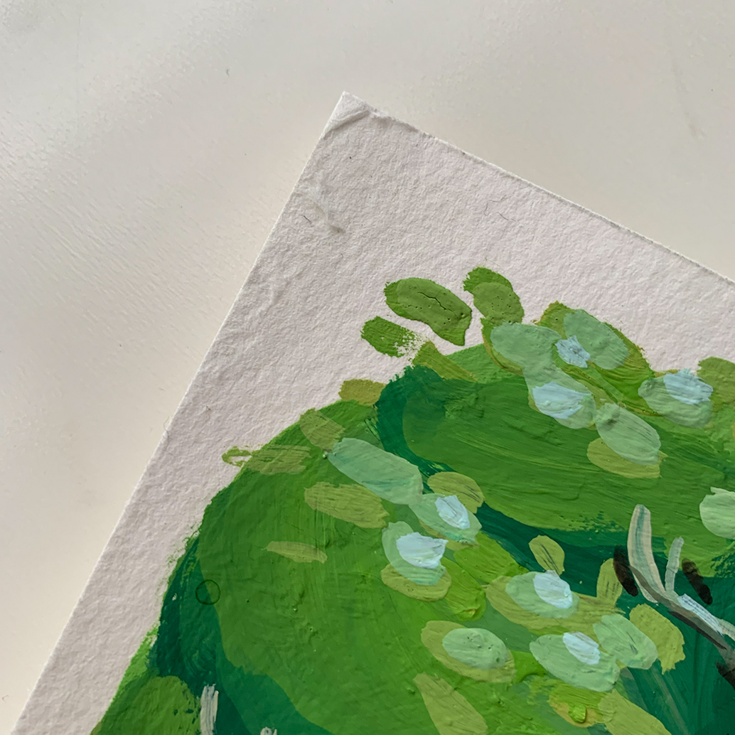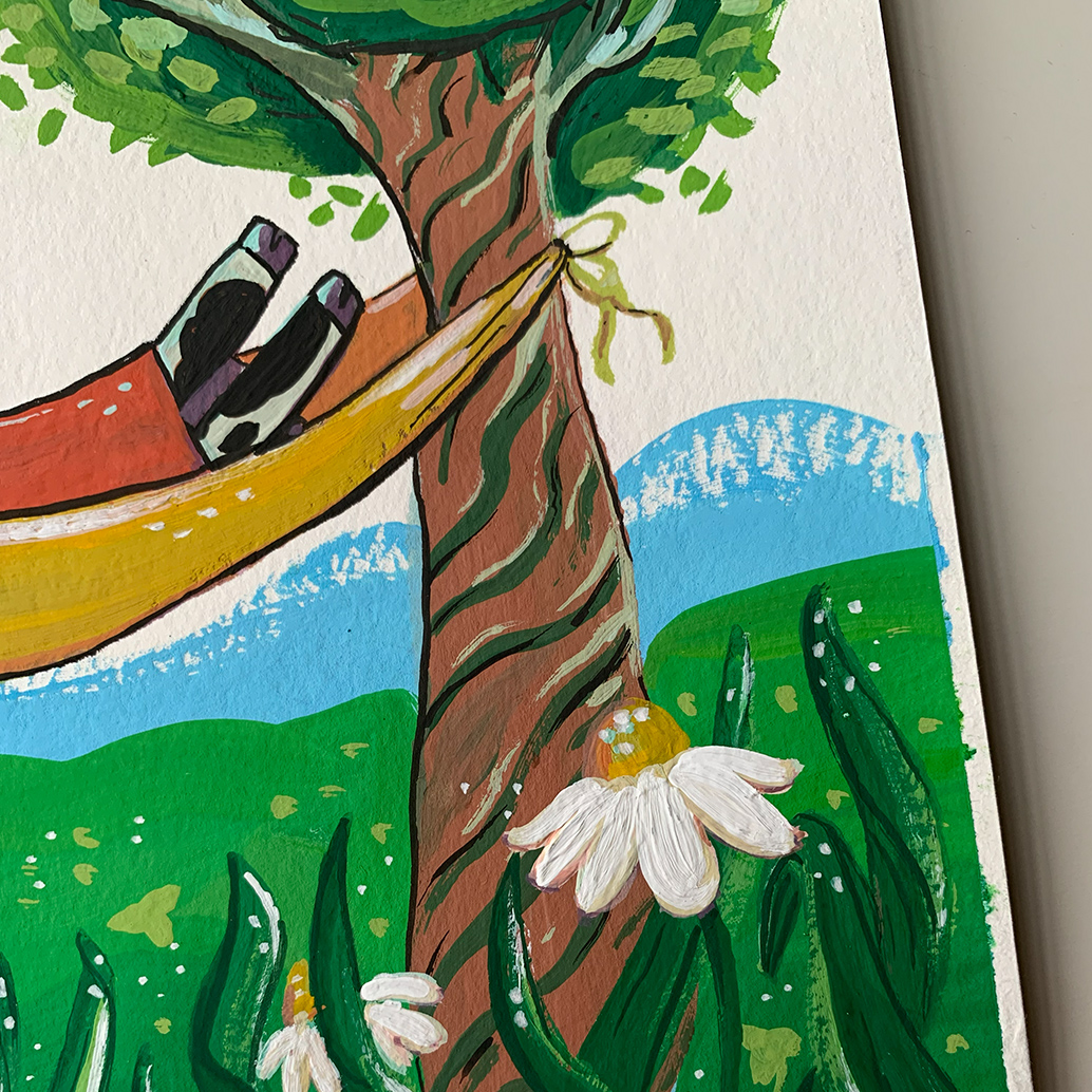 Lehmä on päässyt kesälaitumille! Työ on tehty guasseilla ja puuväreillä.