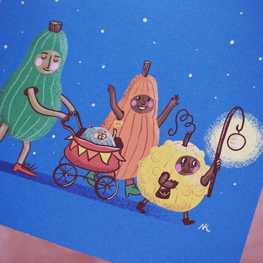 Kurpitsaperhe on lähtenyt öiselle kävelylle, mukaan on otettu kaikki vauvasta mummoon. Mihinköhän he ovat matkalla? Alkuperäinen työ on tehty guassimaaleilla.