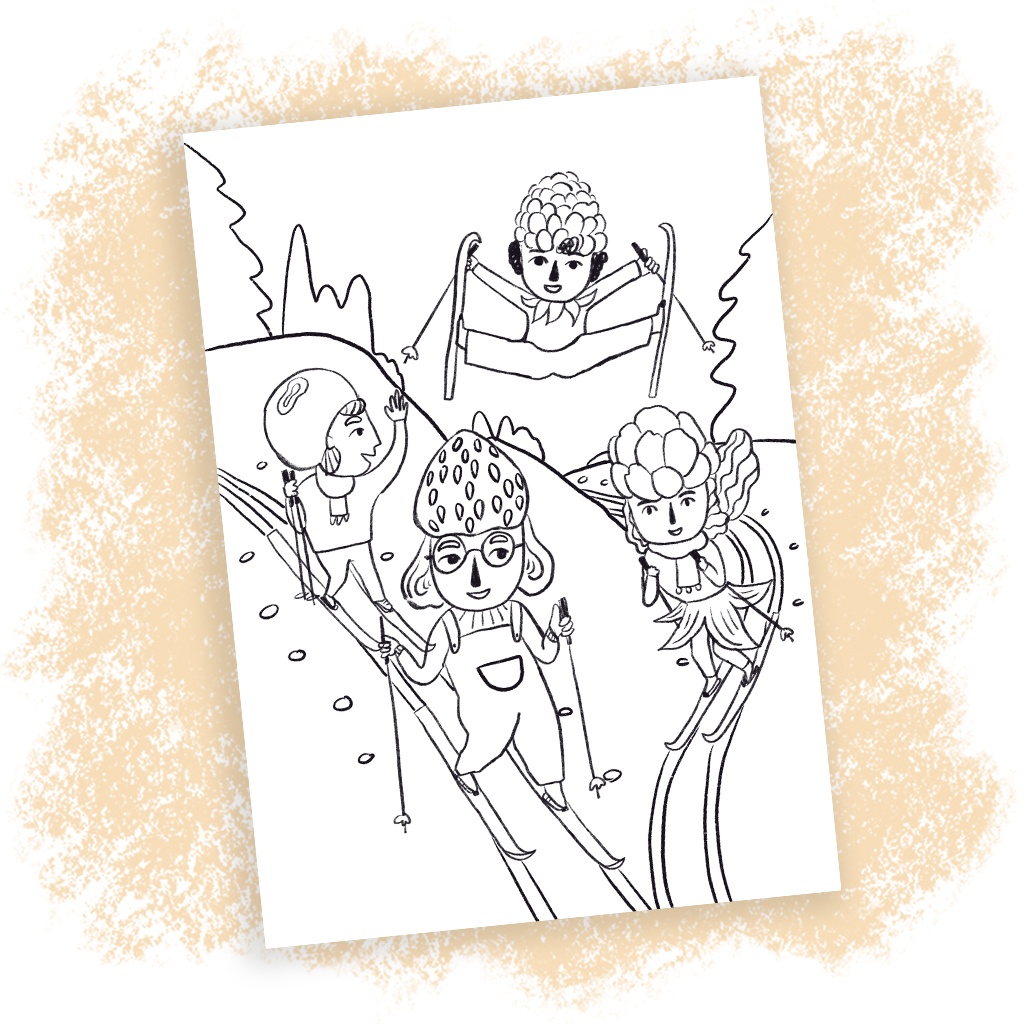 Hauska värityskuva marjalapsista hiihtoretkellä! Ostoksen jälkeen kuva ladataan koneelle ja sen voi tulostaa värityspuuhiin.