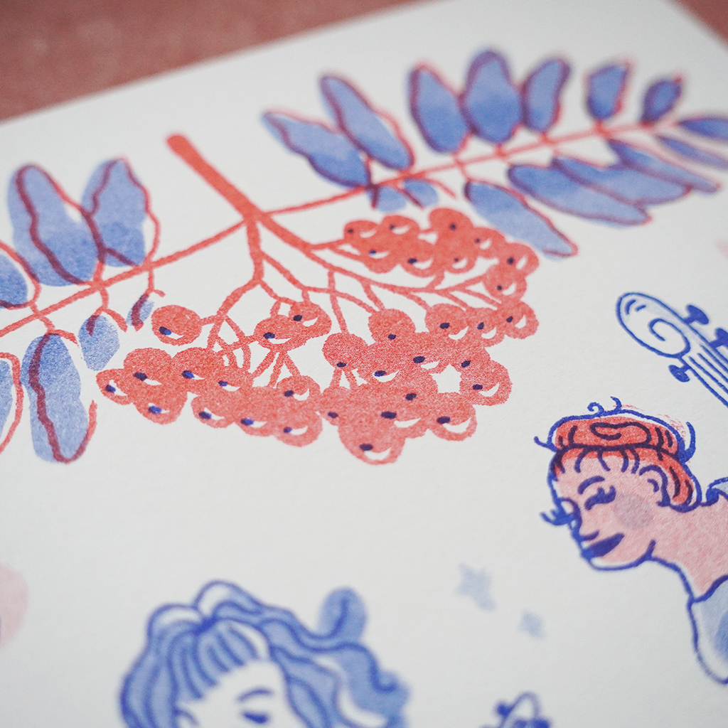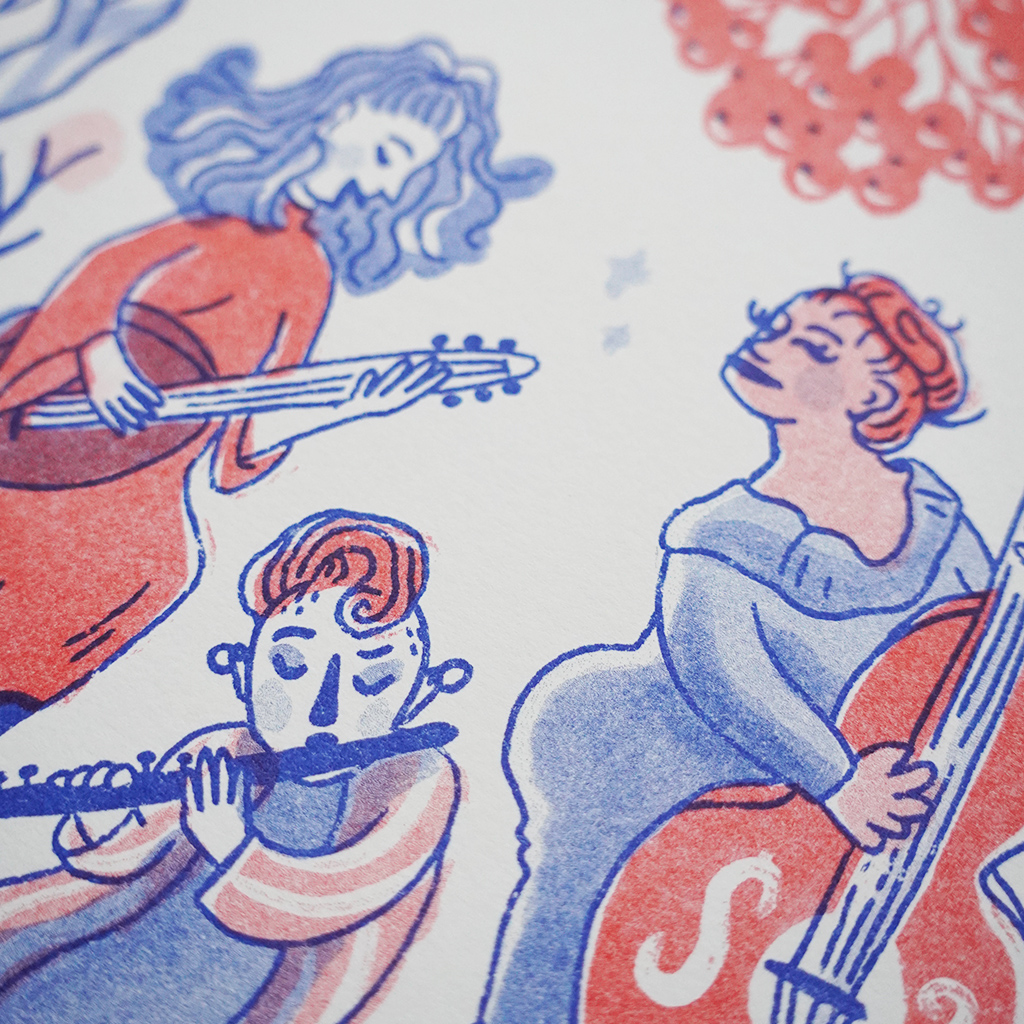 Noitasiskokset ovat perustaneet taianomaisen bändin, jonka musisointi nostaa ilmaan! Printissä on mukana pihlajanmarjoja, koska pihlajanmarjapuu edustaa suomalaisessa kansanperinteessä suojelevaa puuta. Työ on painettu punaisella ja sinisellä risovärillä, joka on myrkytöntä soijamustetta.