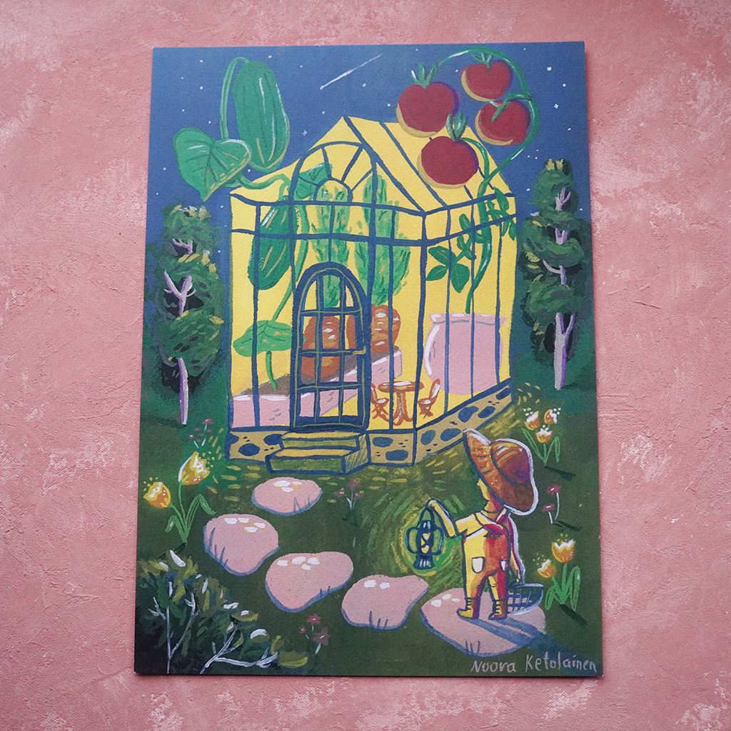 Kesäyössä kasvihuoneella tapahtuu kummia - sato kasvaa jättimäiseksi! Puutarhurilla on onnen päivät. Alkuperäinen työ on tehty guassimaaleilla.