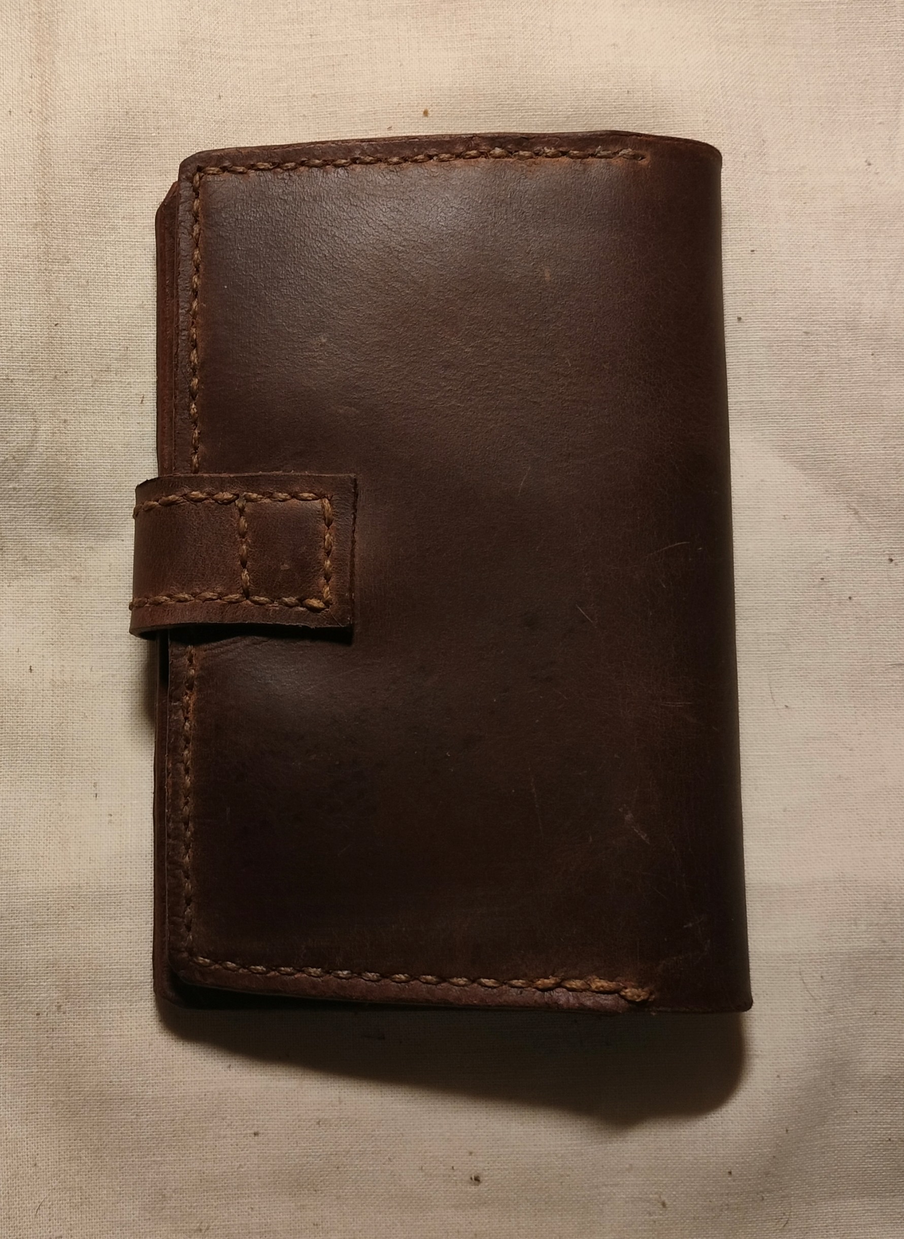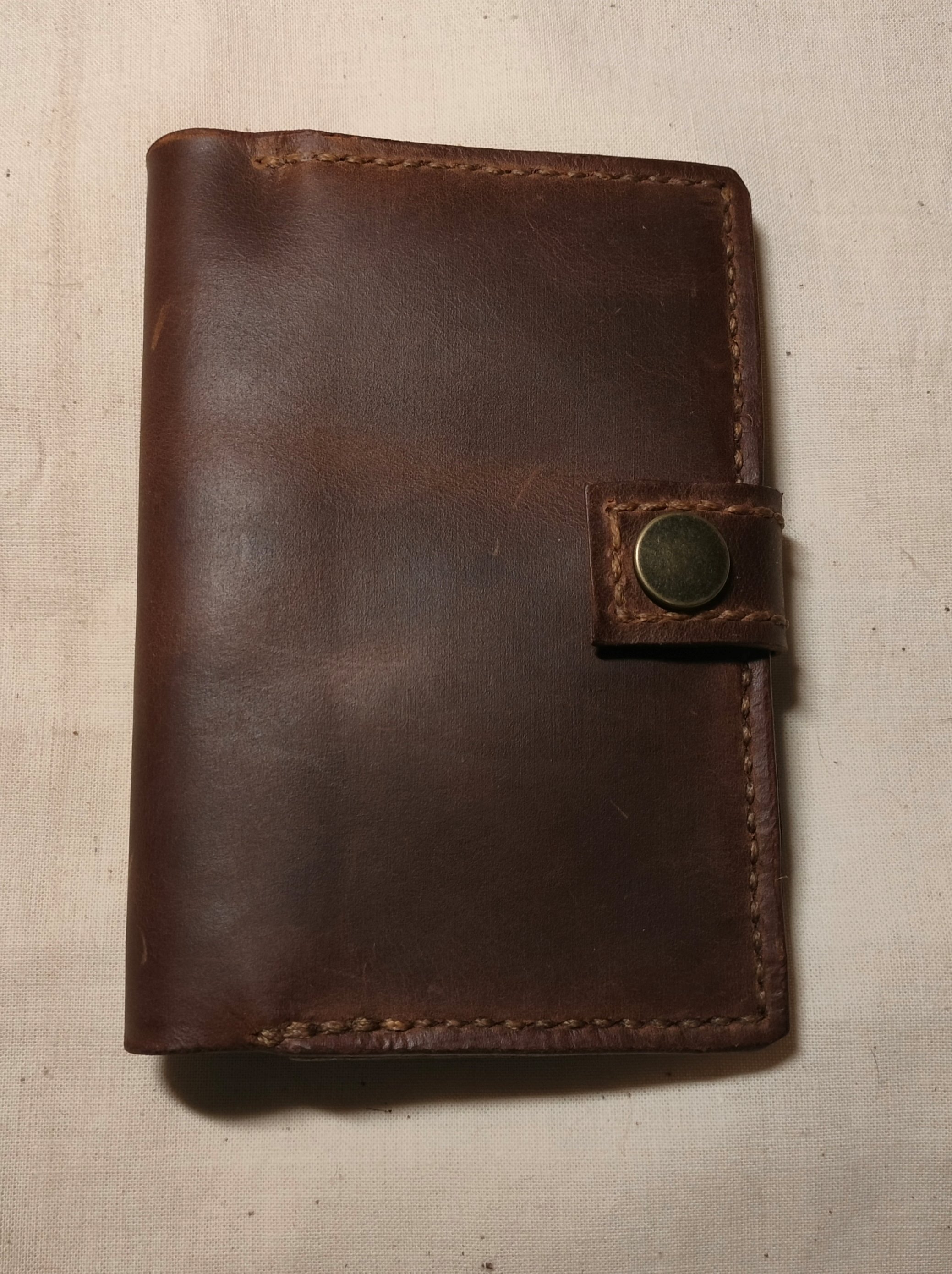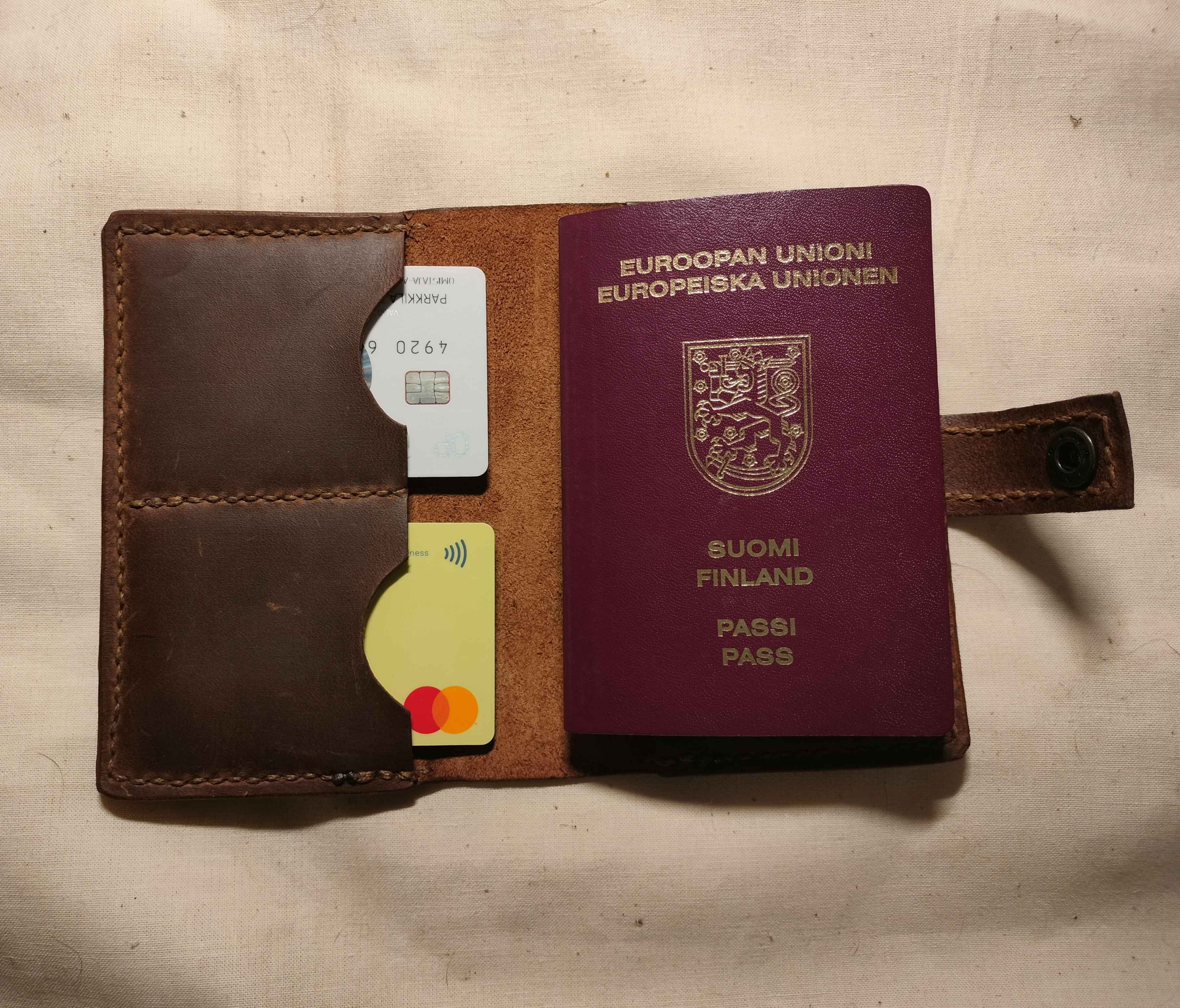 Ruskeaa grazy horse värjättyä pull up efektin omaava ja kevyesti vahattua nahkaa. Omat taskut passille, muutamalle eniten käyttämällesi maksukortille ja tasku vielä taitetuille seteleille, kuiteille yms.
