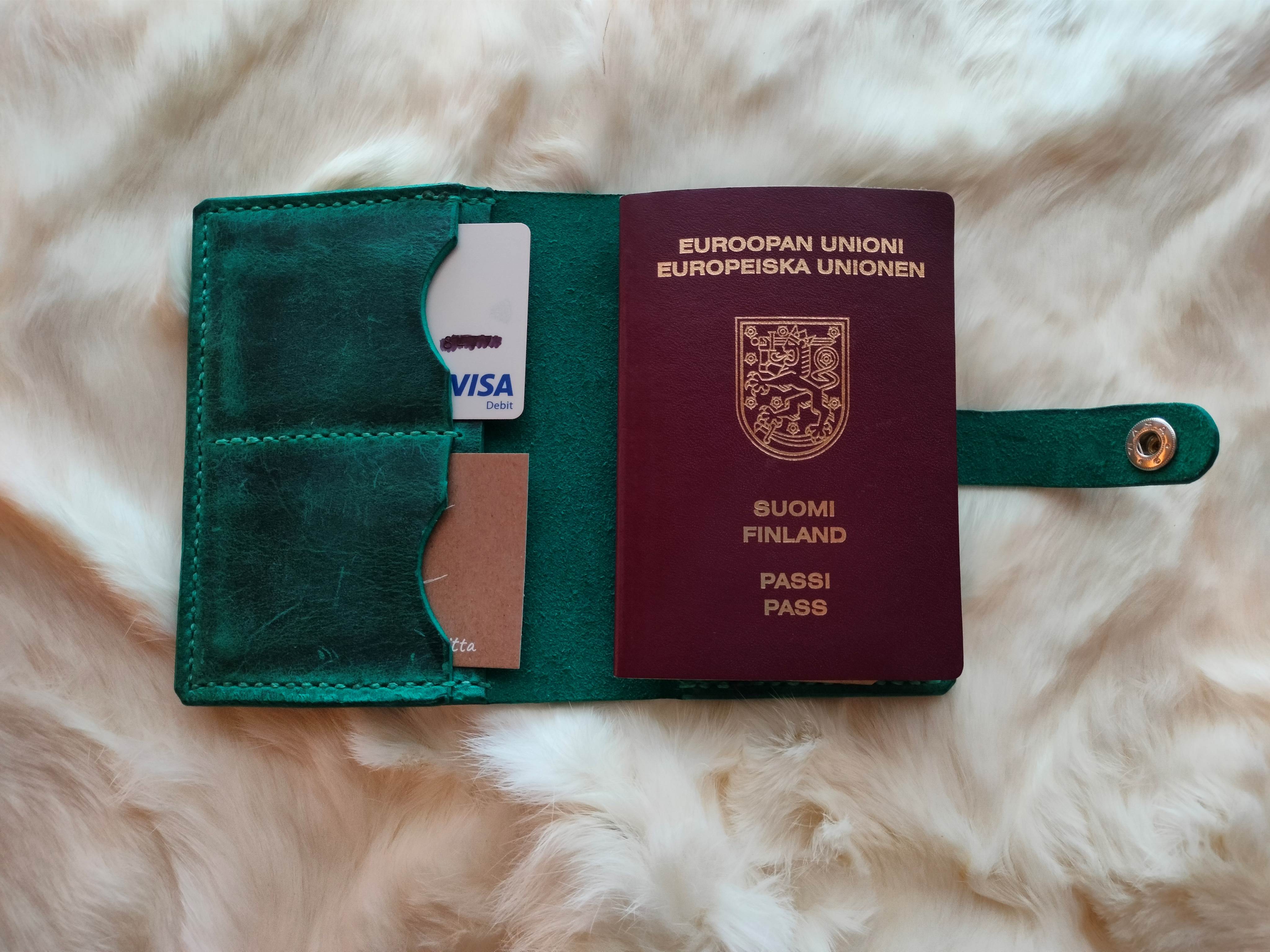 Veden vihreänsininen eli aquan värinen Grazy Horse värjättyä kevyesti vahapintaista nahkaa. Yhdelle passille ja muutamalle kortille.