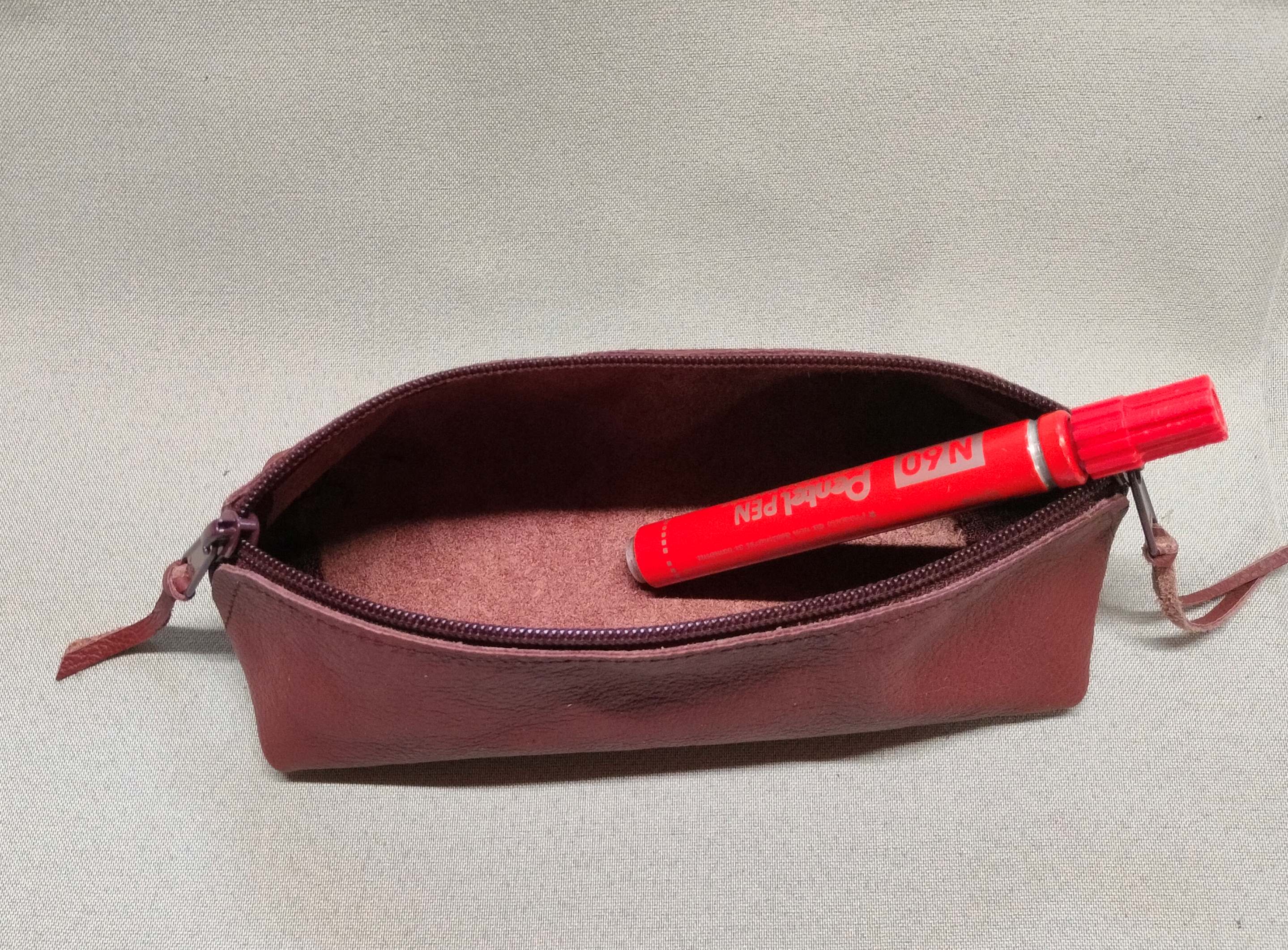 Huonekaluteollisuuden ylijäämänahkaa. Soveltuu penaaliksi, sukkapuikkokoteloksi tai vaikkapa insuliinikynän omaksi pussukaksi.