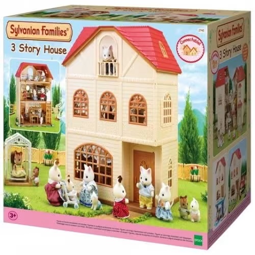 8711915027458 Sylvanian Families'in Kolmikerroksinen talo: Talossa on kolme kerrosta: keittiö, olohuone ja makuuhuoneet. Asukkaat pääsevät kerroksiin tikkaita pitkin.