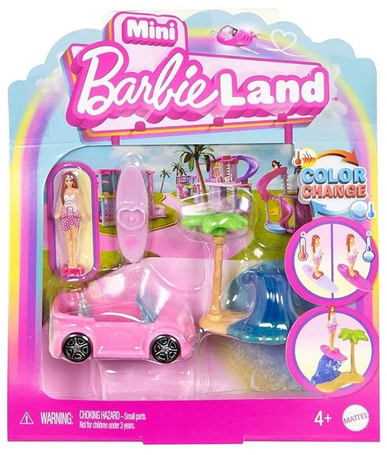 Huomioithan, että verkkokaupassa minimitilausraja on 20€ sis. postikulut. 194735274864 Barbie Mini BarbieLand – avoauto -leikkisetti on mini-Barbie-lelu, joka sisältää pienen (noin 3,8–4 cm) Barbie-mininuken, plážový (rantakabriolet) –ajoneuvon, värinsä vaihtavan surffilaudan sekä palmumaiseman osan, joiden avulla lapset voivat leikkiä ja rakentaa oman Mini BarbieLand -maailmansa täynnä seikkailuja ja mielikuvitusleikkejä