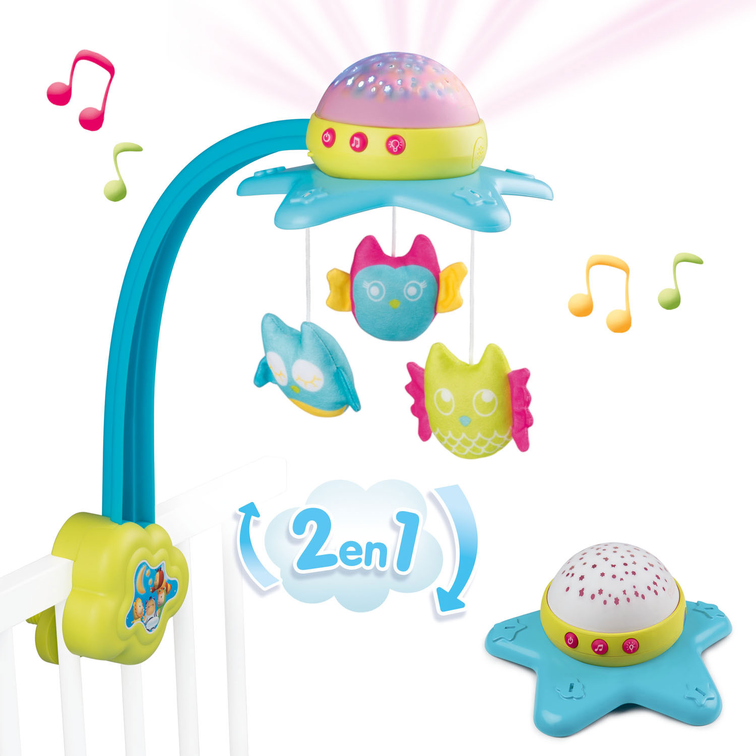 3032161101163 Ihastuttava moottoroitu Smoby Cotoons tähtimobilemobile kiinnitetään vauvan sängyn reunaan nokkelalla kiinnityssysteemillä. Tähtimobile pyörittää pöllöjä ja heijastaa kattoon kauniita, pehmeästi väriä vaihtavia kuvioita, jotka liikkuvat musiikin mukana. Musiikkimobilesta kuuluu neljä erilaista melodiaa. Voit myös käyttää mobilea ilman valoa tai ääntä ja irrottaa sen varrestaan pöydällä käytettäväksi. Erikoisominaisuutena tähtimöbilessa on äänitunnistin, joka reagoi sormien napsautukseen tai lapsen itkuun. Paristot: LR6 1.5V x 3 (eivät sisälly pakkaukseen). Sopii vastasyntyneelle.