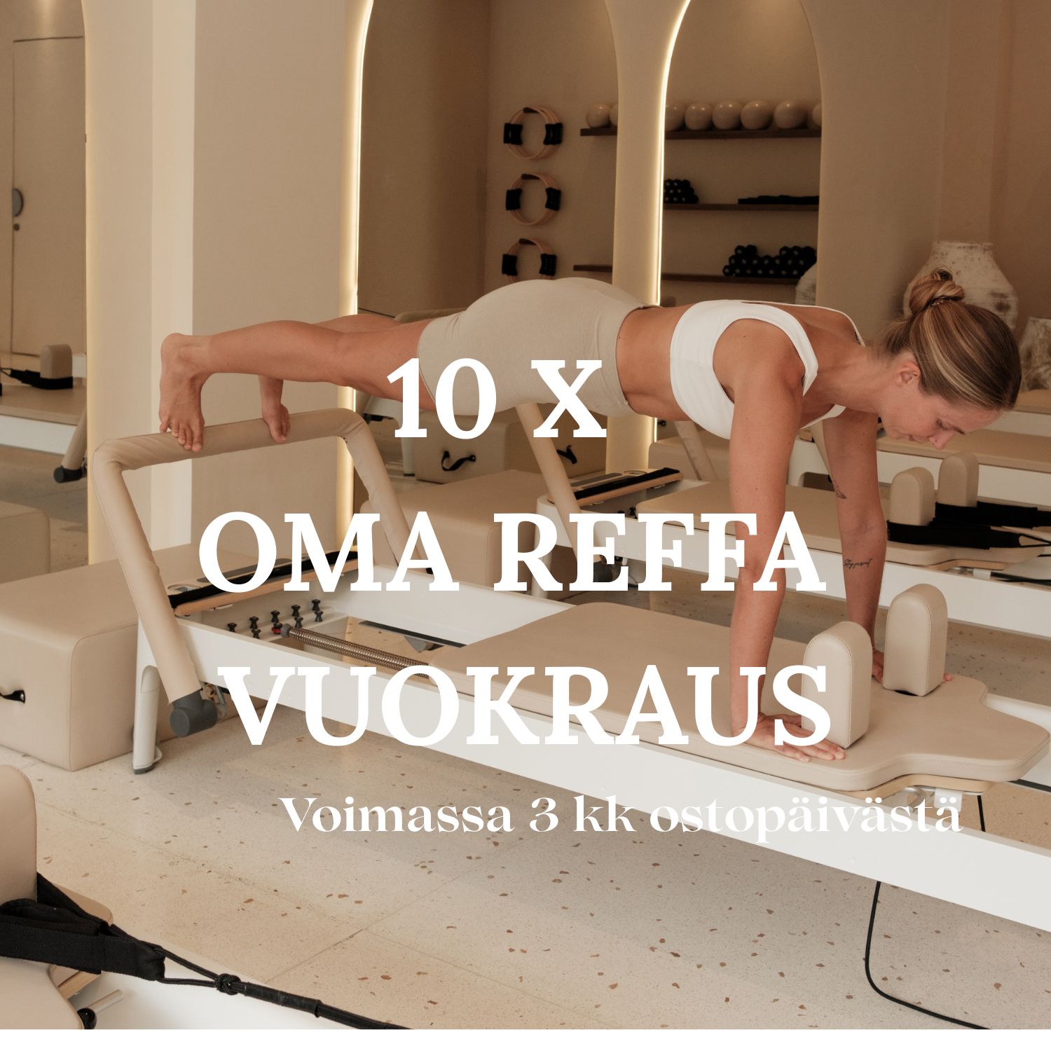 Oma reffa vuokraus - voit vuokrata meiltä reformerin 10 X omaan käyttöösi kun reformerit eivät ole ohjattujen tuntien käytössä. Harjoittele itsenäisesti omaa ohjelmaasi ja treenaa milloin vain ja super edullisesti! Ei jonotusvuoroja, harjoittele milloin sinulle parhaiten sopii. Kortti on henkilökohtainen. Reformer tulee olla sinulle tuttu laitteena ja harjoitusmuotona. Emme suosittele reformerin vuokrausta mikäli laji ei ole sinulle tuttu.