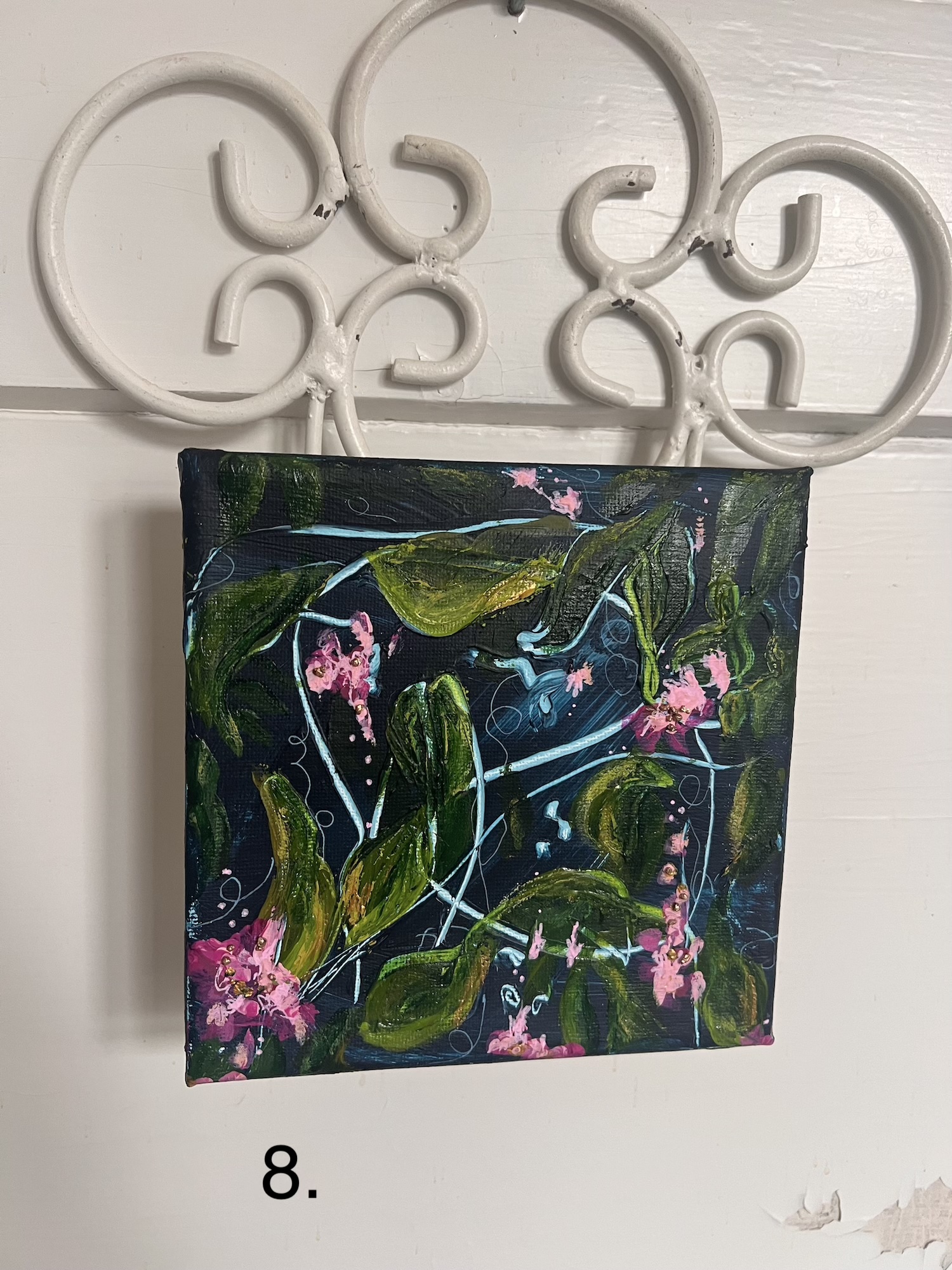 Jokainen näistä yhdeksästä 15 x 15 cm teoksesta on oma pieni maailmansa. Siveltimen jäljet kuljettavat katsetta kuin heinänvarret tuulessa, ja herkät vaaleanpunaiset kukat pilkahtelevat kuin sattumanvaraiset löydöt kedolla kulkiessa. Vaaleat, risteilevät viivat muistuttavat juurista, poluista tai ajatuksista – siitä, miten kaikki on yhteydessä toisiinsa.