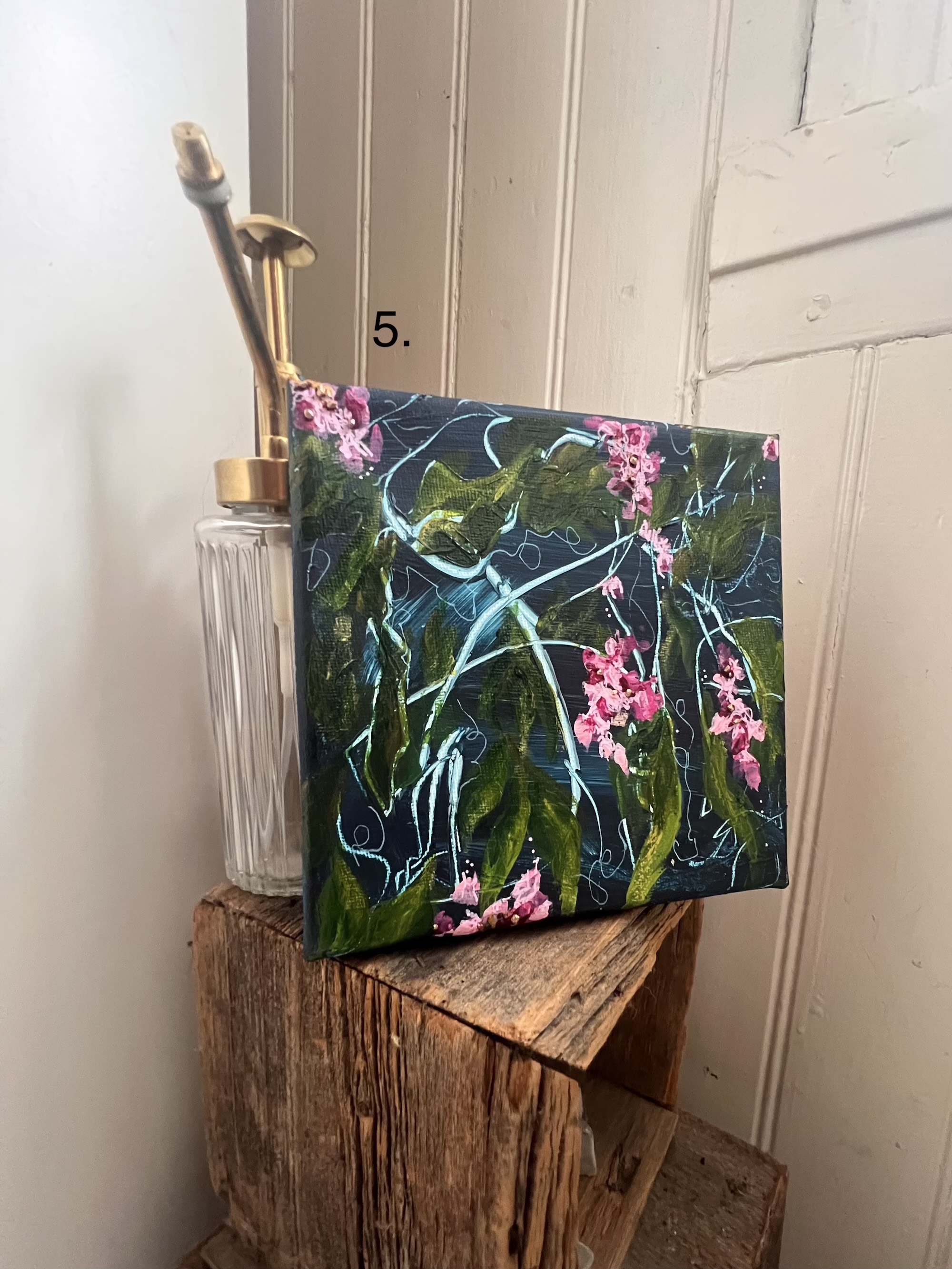Jokainen näistä yhdeksästä 15 x 15 cm teoksesta on oma pieni maailmansa. Siveltimen jäljet kuljettavat katsetta kuin heinänvarret tuulessa, ja herkät vaaleanpunaiset kukat pilkahtelevat kuin sattumanvaraiset löydöt kedolla kulkiessa. Vaaleat, risteilevät viivat muistuttavat juurista, poluista tai ajatuksista – siitä, miten kaikki on yhteydessä toisiinsa.