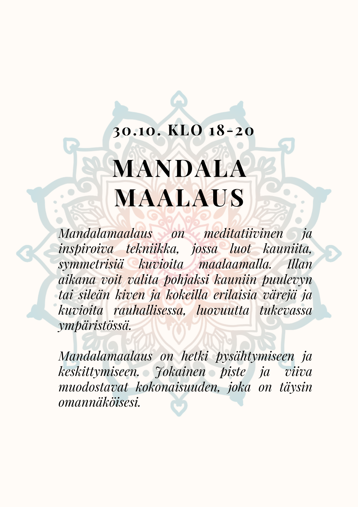 30.10. Mandalamaalaus: Meditatiivinen ja inspiroiva ilta, jossa voit maalata kauniita, symmetrisiä kuvioita puulevylle tai kiveen ja löytää rauhoittavan luovan flow’n.