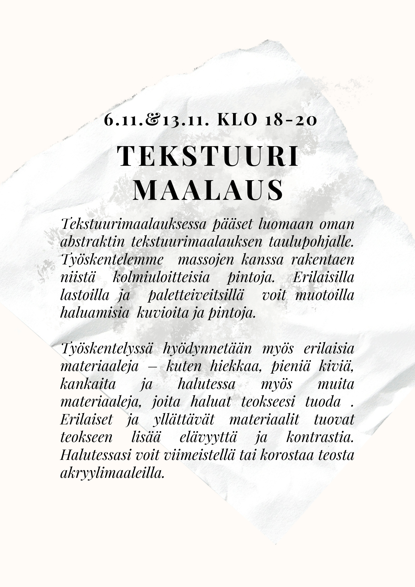 6.11. & 13.11. Abstrakti tekstuurimaalaus I&II: Työskentelyssä hyödynnetään erilaisia materiaaleja – kuten hiekkaa, kiviä, kankaita ja halutessa myös muita materiaaleja, joita haluat teokseesi tuoda itseltäsi. Muotoile ja sommittele teokseen kiinnostavia kolmiulotteisia kuvioita.
