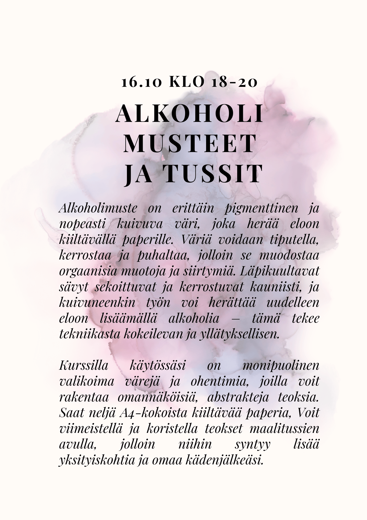 16.10 Alkoholimuste: Kokeile nopeasti kuivuvia, kirkkaan pigmenttisiä värejä ja luo abstrakteja, orgaanisia muotoja kiiltäväpintaiselle paperille. Leiki väreillä ja kerroksilla syntyvillä pinnoilla.