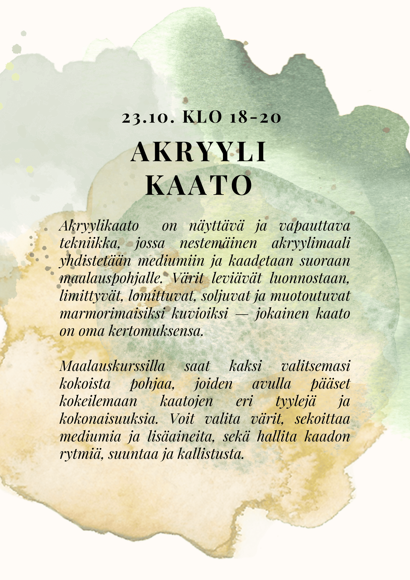 23.10. Akryylikaato: Anna maalien virrata! Kaada ja valuta. Värit leviävät luonnostaan, limittyvät, lomittuvat, soljuvat ja muotoutuvat marmorimaisiksi kuvioiksi — jokainen kaato on oma kertomuksensa.