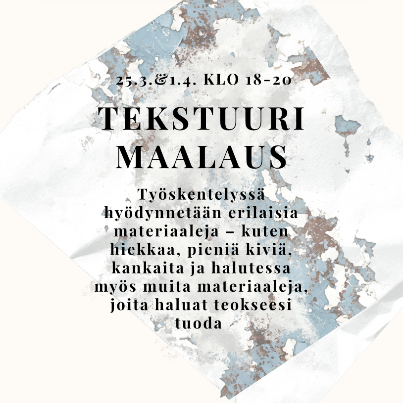 1.4. & 8.4. Abstrakti tekstuurimaalaus I&II: Työskentelyssä hyödynnetään erilaisia materiaaleja – kuten hiekkaa, kiviä, kankaita ja halutessa myös muita materiaaleja, joita haluat teokseesi tuoda itseltäsi. Muotoile ja sommittele teokseen kiinnostavia kolmiulotteisia kuvioita.