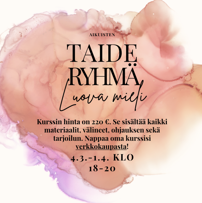 Hinta 220 €, sisältäen kaikki materiaalit, välineet, ohjauksen ja iltateet sekä pikkuleipiä. Varaa paikkasi, niitä on rajoitetusti! Vain 6 paikkaa. Maksuvälineinä käy myös Edenred sekä E-passi. Paketin voi maksaa myös kahdessa erässä. Varaa virike-edulla ja erissä maksaessasi paikkasi tanja@luovamieli.com. Varaus on sitova.