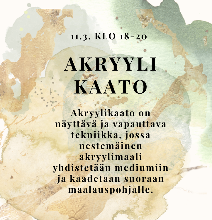 18.3. Akryylikaato: Anna maalien virrata! Kaada ja valuta. Värit leviävät luonnostaan, limittyvät, lomittuvat, soljuvat ja muotoutuvat marmorimaisiksi kuvioiksi — jokainen kaato on oma kertomuksensa.