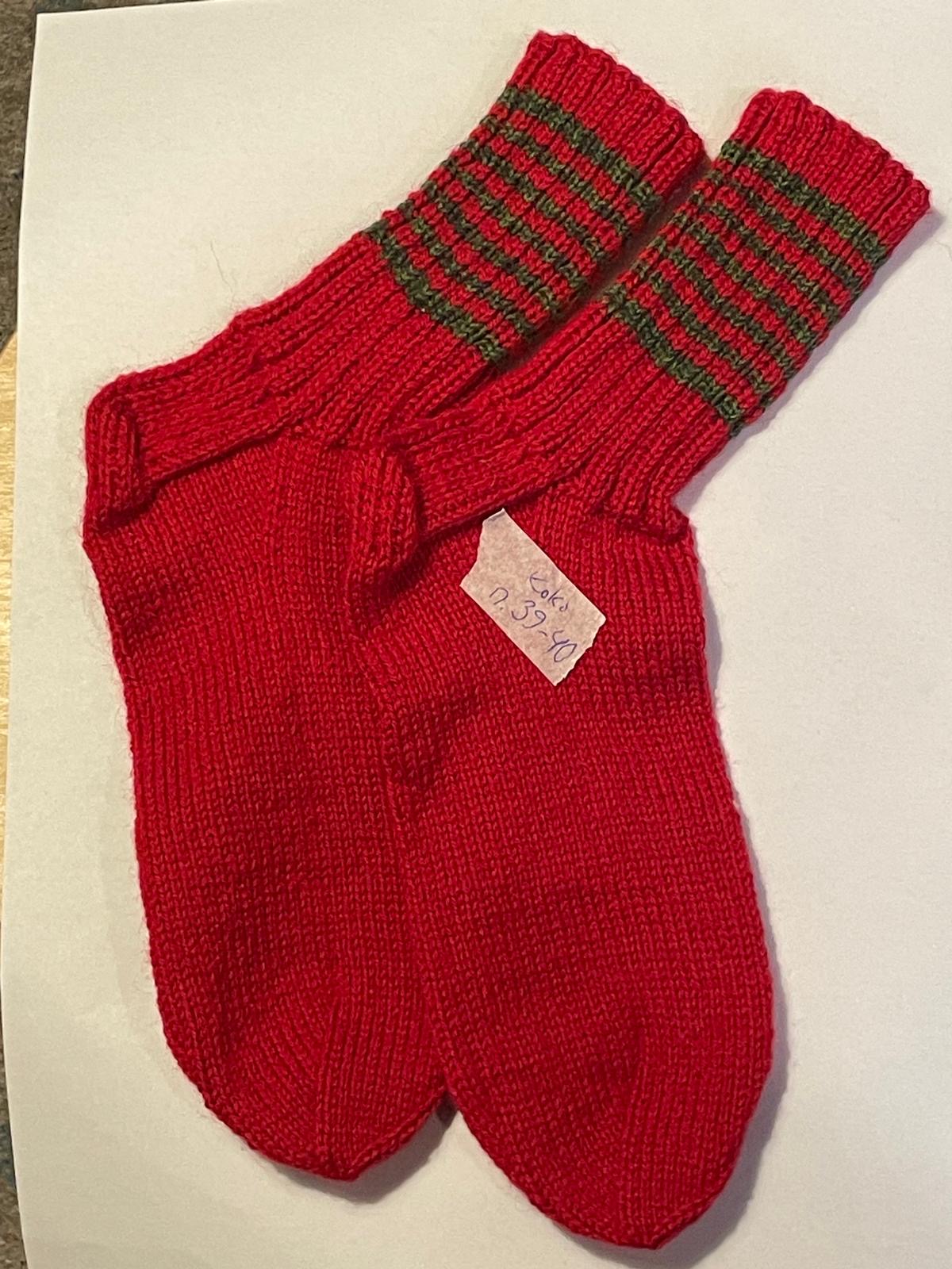Villasukat, koko noin 39/40. Punaiset, harmaat raidat. Tuotto kokonaisuudessaan MLL Konalan hyväksi.