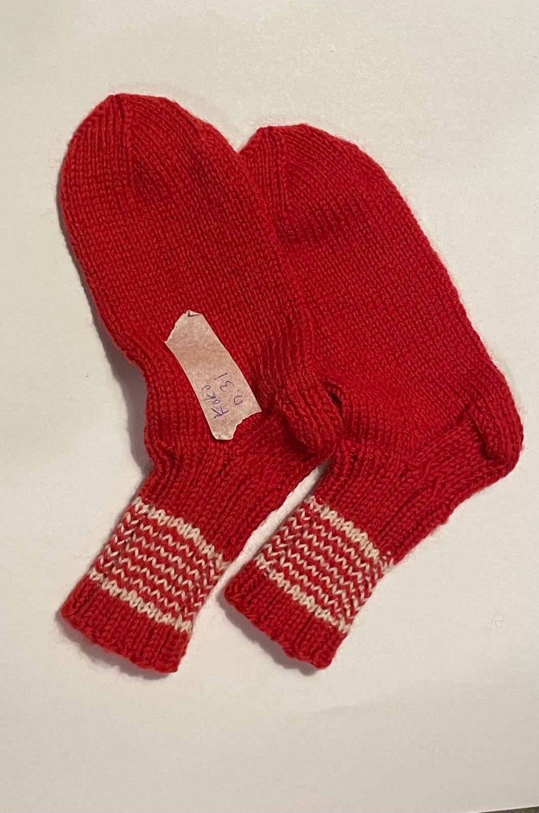 Lasten villasukat. Koko n. 31. Punaiset, valkoiset raidat. Tuotto kokonaisuudessaan MLL Konalan hyväksi.