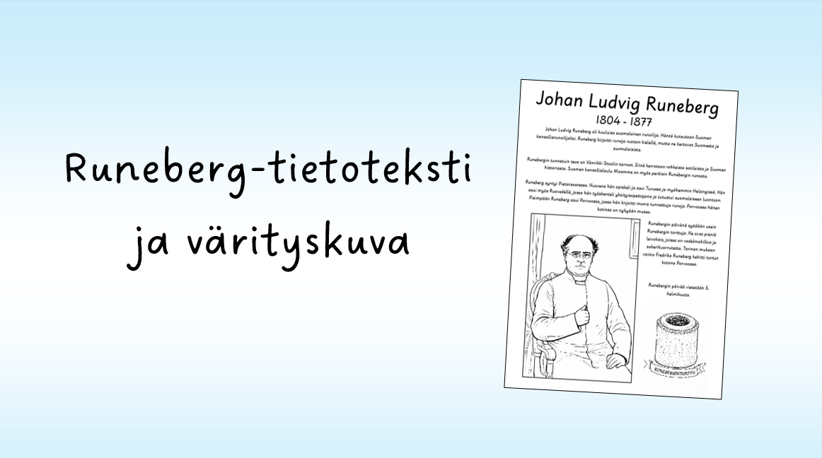 Yhden sivun kopioitavaksi tarkoitettu tietoteksti ja värityskuva Runebergistä.