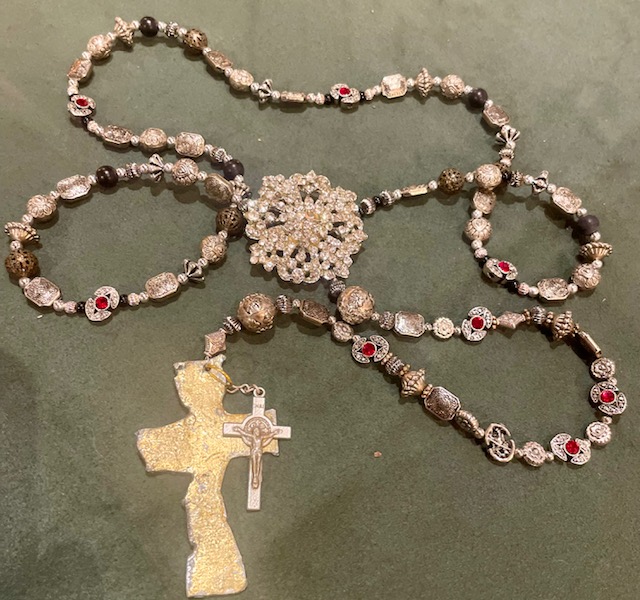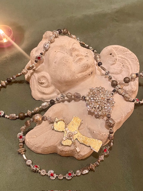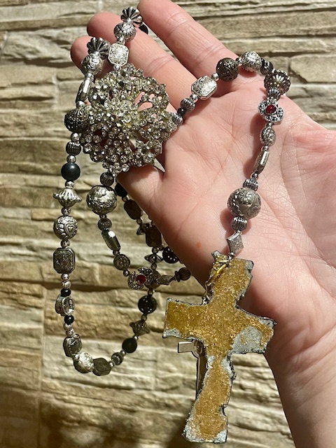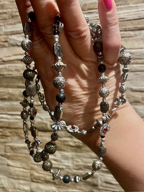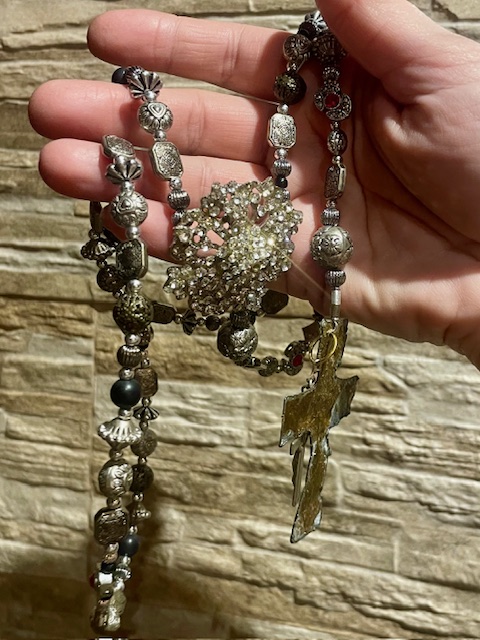 Kodin koru, tämä kuninkaallinen, kirkkaan punaisia "rubiineitakin" omaava helminauha on huoneen keskipiste, kimaltelee kauniisti. Tekemäni ristin koristelema helminauha joka sopii parhaiten kodin rauhoittavaksi somisteeksi. Voit laittaa sen roikkumaan johonkin, josta sen näet joka päivä. Olen suunnitellut ja leikannut ristin metallista. Hopean sävytteinen koru. Helmet lasia, resiiniä ja sidottu ohuella kultalangalla. Toista samanlaista ei tule vastaan. Tämä on ainoa kaltaistaan ja yksittäiskappale. Katso kaikki kuvat, otin useista eri kulmista. Korulla on tilaan vakautta ja ehkä vaurauttakin levittävä vaikutus. Korkeus 70cm ja ristin korkeus 7cm.Valmistan kaikki teokseni täällä Etelä-Pohjanmaalla, metsän keskellä hirsipirtissäni - kiitos siis kun tuet taidettani! Lähetän seurattavana pakettina. Parhaiten toimii somisteena, tosin varoen voi käyttää myös meditaatio / rukousnauhana