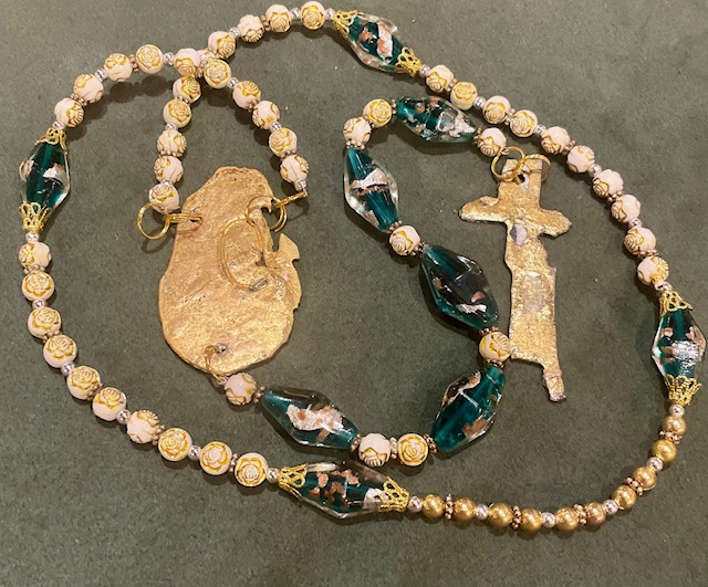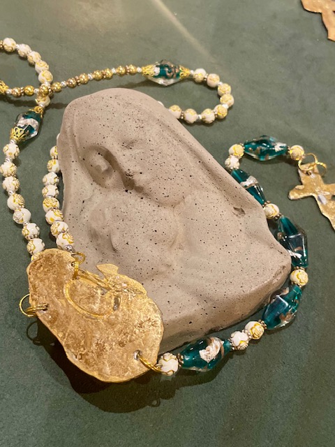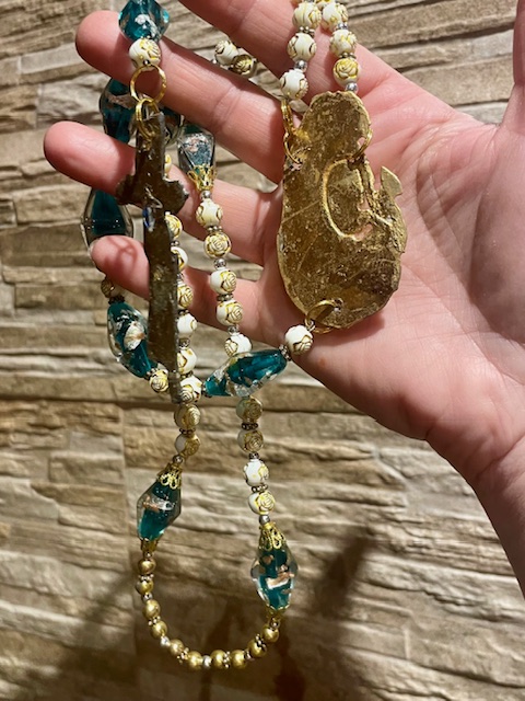 Kodin koru: KOHTU, on kookas uniikki isohelminen, pienemmät helmet valkoisia, joissa yksityiskohtainen ruusukuvio, sopiihan se pehmeään äitiyteen. Tekemäni kultaisen kohdun ja ristin koristelema helminauha joka sopii parhaiten kodin rauhoittavaksi somisteeksi. Voit laittaa sen roikkumaan johonkin, josta sen näet joka päivä. Olen suunnitellut ja leikannut isot kultaosat metallista. Helmet lasia, resiiniä ja sidottu ohuella kultalangalla. Toista samanlaista ei tule vastaan. Tämä on ainoa kaltaistaan ja yksittäiskappale. Katso kaikki kuvat, otin useista eri kulmista. Korulla on tilaan rakkautta, äitiyttä levittävä vaikutus. Sopii hyvin vauvaa odottavalle tai suunnittelevalle tai äidille. Korkeus 65cm ja ristin korkeus 8cm, "kohtu" 7cm. Valmistan kaikki teokseni täällä Etelä-Pohjanmaalla, metsän keskellä hirsipirtissäni - kiitos siis kun tuet taidettani! Lähetän seurattavana pakettina. Parhaiten toimii somisteena, tosin varoen voi käyttää myös meditaatio / rukousnauhana