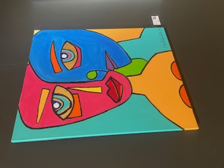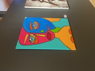 Väsyneet onnelliset 100x80 on vahvan värinen ja näyttävä maalaus kankaalle, kangas kiristetty kiilapuihin, ja myös reunat maalattu, eli tätä ei tarvitse kehystää, ellet niin halua. Teos on ripustusvalmis, vaijeri takana, kun sen sinulle lähetän.