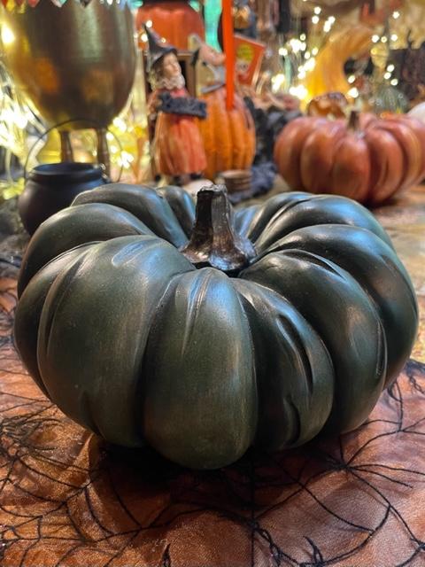 Herkullisen tummanvihreän rustiikkisen sävyinen kurpitsainen, sopii ympäri vuoden koristeksi. Hillitty, arvokkaan oloinen ja kauniisti värjätty. Kuvissa muitakin myynnissä olevia somisteita, mutta tämä tuo pyöreä, vihreä "perinteisen" kokoinen ja mallinen herraskainen.
