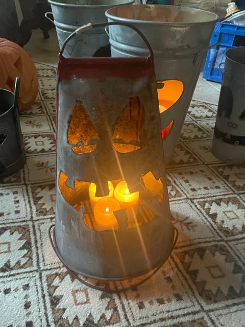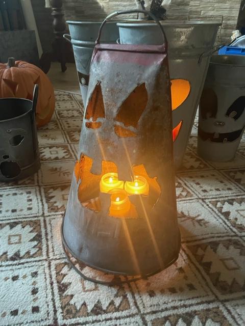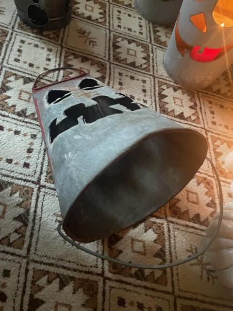 Herra Palomestari - papparainen, jo elämää paljon nähnyt, peltinen antiikki vedenkuljetus ämpäri, herättää hymyn kenen tahansa huulille :) uniikki hieman sekopäinen kaveri joka on putsailtu ja patinoitunut ja omin kätösin suunnittelema/leikkaama somiste tai lyhty ja sopii ihan perus koristeeksikin pihalle tai terassille. Tämä ei pienistä tuulista lentoon lähde. Sen voi myös ripustaa roikkumaan, pohjaa ei ole. Vanhaherra palomies, on sisäpuolelle signeerattu ja ainoa laatuaan, uniikki, valtaisa reilut 50cm kahvoineen (ylä ja alapuoli) cm korkea ja 27cm leveä, paksupeltinen lyhty, Syksyn kurpitsajuhlan somistuksiin & Halloween sisustukseen. Uniikki siksi, että teen kaikki omin käsin täällä Etelä-Pohjanmaalla, metsän keskellä, pienoisessa pirtissäni: piirrokset, peltiinleikkaukset, mahdolliset maalaukset sekä tekstit, joten jokainen on rakkaudella valmistettu ja yksittäiskappale, toista samanlaista ei ole. Ja myös Palomestari sopii esille koko vuoden, voit kääntää sen "takapuolen" esille muina aikoina, jolloin näyttää papparainen ihan "perus" metallilieriöpurkilta :) Kuvassa useampia hopeanvärisiä peltisiä lyhtyjä mutta Palomestari -herran tunnistat kyllä omituisen muotonsa vuoksi - teen mielelläni sisustus"leikkauksia" myös tilaustöinä! PS. jos tulee mitä vain kysymyksiä mieleesi tai jos olet epävarma koosta tai sopivuudesta kotiisi, ota minuun yhteyttä, vastaan mielelläni ja koska mahdolliset palautuskulut tulevat sinulle maksettavaksi, kiitos! Sähköpostini marikakkshop@gmail.com Pakkausmateriaaleina käytän kierrätyspahveja, luonnollisesti! Tsekkaa myös instasta @kurpitsavilla sekä taiteilijasivuni @marikakk_lettering