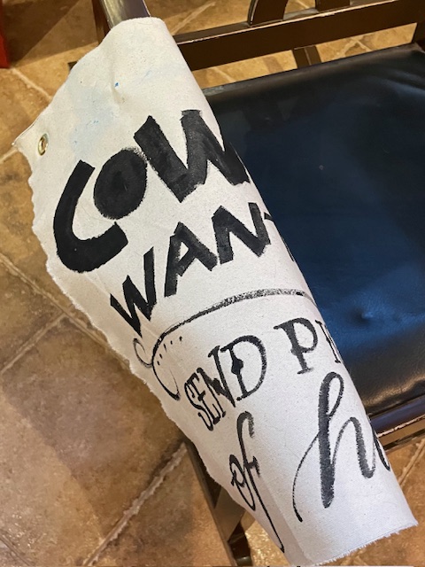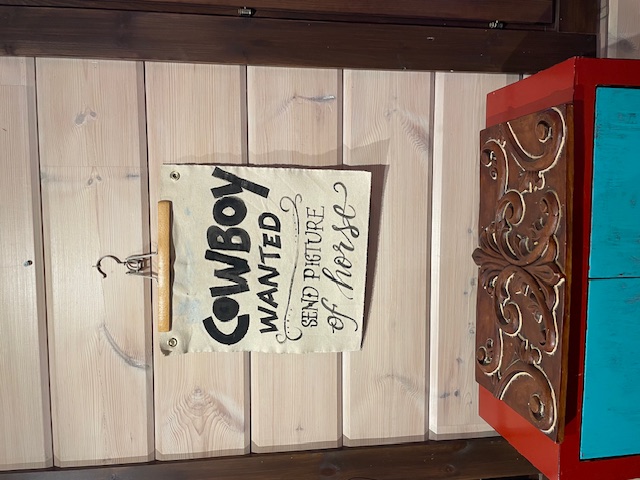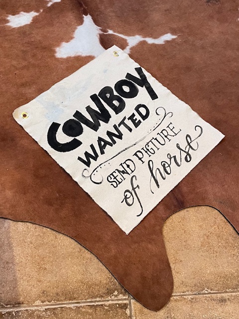 Cowboy wanted, send picture of horse, 44x40cm, Uniikki Seinälle ripustettava kankainen teos, joka ei ole vain koriste, vaan inspiraation lähde jokaiselle katselukerralle. Käsin maalattu ja suomalaista käsityötä. Hymyn herättävä heitto tai sanonta rohkeaan ja humoristiseen kotiin. Hyvä keskustelunaloittaja :) Erittäin kuluneen rustiikkiseksi käsitelty! Ei kehyksiä vaan ripustus metallirenkaiden avulla, naulalla, nastalla tai vaikkapa narulla. Rustiikkinen tausta: kankaan takapuolikin on käsitelty maaleilla ja väreillä, eli tämä on kokonaan kuin vanhasta kankaasta leikattu pala. HUOM! Myös reunat epätasaiset ja päättelemättömät.