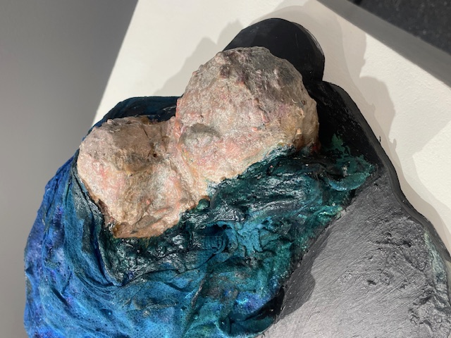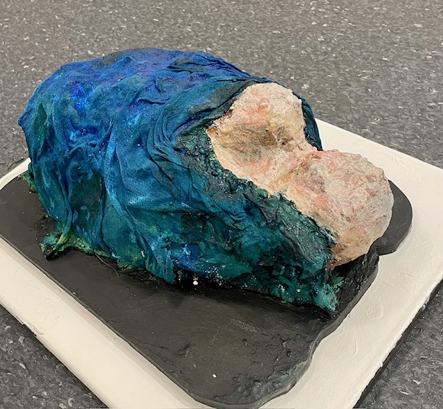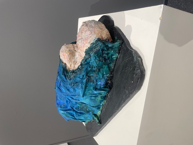 Raastava yksinäisyys, kipsi-maalit-kangas, noin 30cm korkea ja 25cm leveä alustalle asetettava veistos