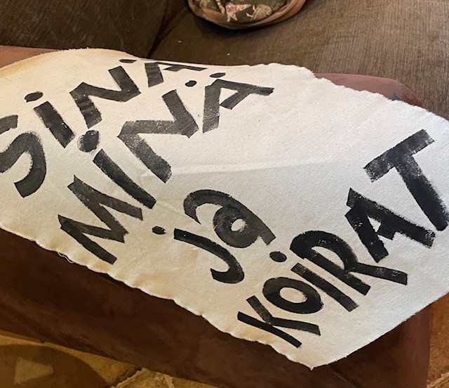 Uniikki Seinälle ripustettava kankainen teos, 50x34cm, joka ei ole vain koriste, vaan inspiraation lähde jokaiselle katselukerralle. Käsin maalattu ja suomalaista käsityötä. Hymyn herättävä heitto tai sanonta rohkeaan ja humoristiseen kotiin. Hyvä keskustelunaloittaja :) Erittäin kuluneen rustiikkiseksi käsitelty! Ei kehyksiä vaan ripustus metallirenkaiden avulla, naulalla, nastalla tai vaikkapa narulla. Rustiikkinen tausta: kankaan takapuolikin on käsitelty maaleilla ja väreillä, eli tämä on kokonaan kuin vanhasta kankaasta leikattu pala. HUOM! Myös reunat epätasaiset ja päättelemättömät.