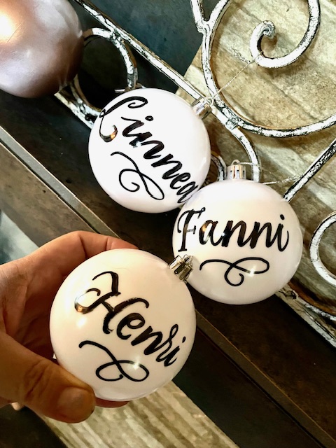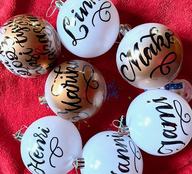 Käsin tekstattu ja maalattu joulupallo (3kpl) , kiva lahjaidea tai ihan itselle :) Kun teet tilausta, siellä on kysymyskenttä, johon saat kirjoittaa etunimet, jotka haluat palloihin. Muovisen pallon halkaisija on noin 8 cm ja toimitan sen ripustusvalmiina, ripustuslenkki on kapeaa ohutta hopeanväristä lankaa. Pallo on muovia, kiiltäväpintainen ja valkoinen. Huomioithan, että toimitan tuotteet kierrätyspaketeissa eli ne eivät tule valmiissa joulupaketissa, näin voit itse paketoida ne haluamallasi tavalla. Isommat erät edullisesti, kysy tarjousta haluamallesi määrälle. Vastaan oikein mielelläni kysymyksiin eli laita tiedustelua marikakkshop@gmail.com