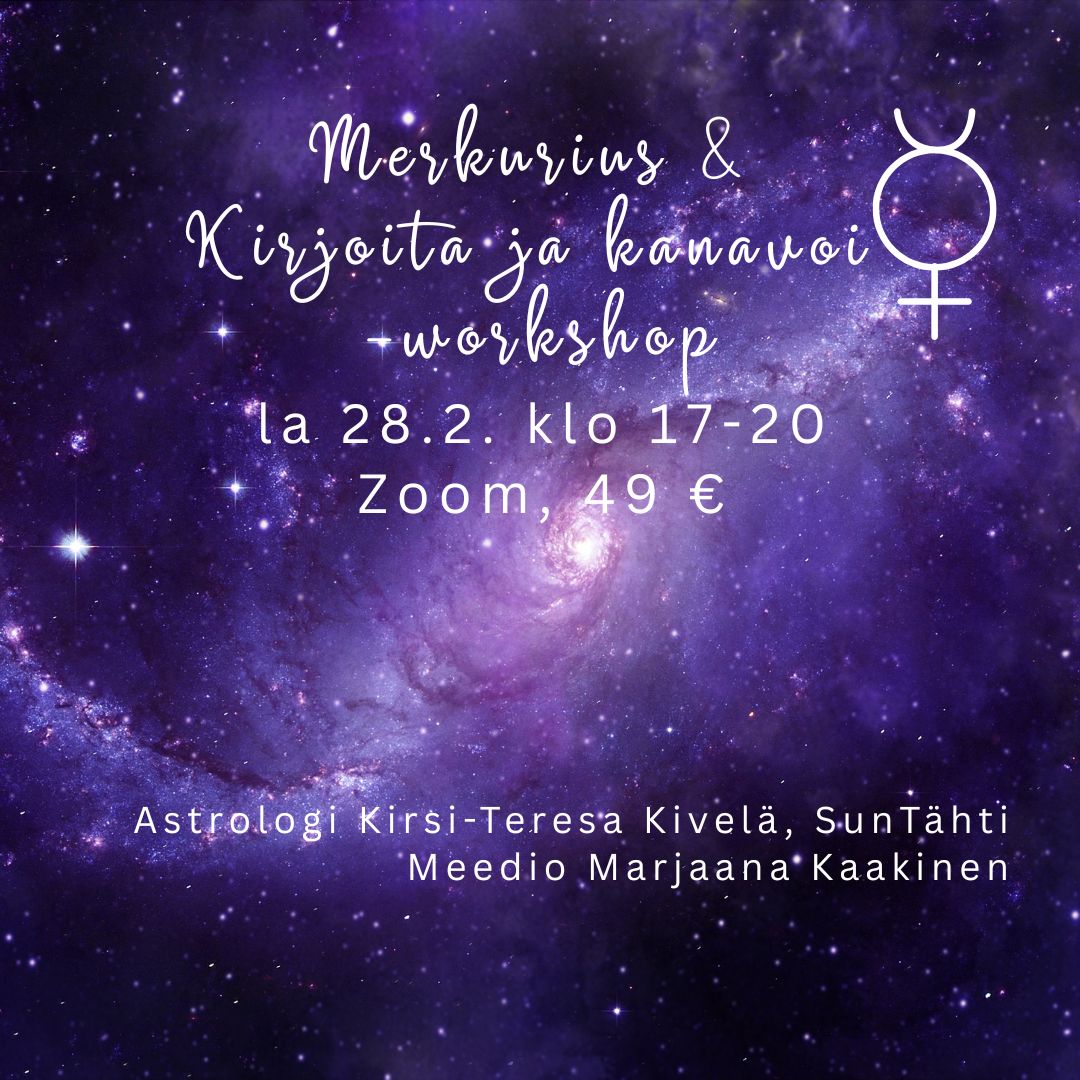 Merkurius on viestin tuoja mytologiassa ja astrologiassa - missä se sijaitsee syntymäkartallasi? Merkurius toimii linkkinä alitajunnan ja päivätajunnan välillä, se on myös kirjoittajien ja kirjailijoiden planeetta. Teemme myös ohjattuja meditaatioita, ja kokeilemme inspiraatio- ja automaattikirjoittamista henkimaailman ihanassa ohjauksessa kalevalanpäivän energioissa.