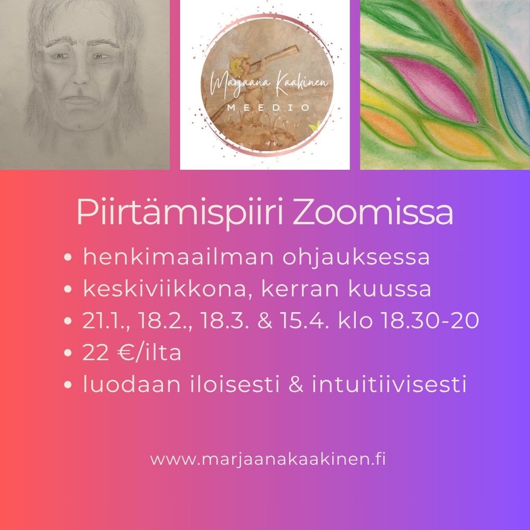 Tule mukaan piirtämään yhdessä henkimaailman ihanassa ohjauksessa - eikä sinun tarvitse osata ennalta mitään. Teemme ohjattuja meditaatioita ja piirrämme mm. auragrafeja ja henkimaailman kasvokuvia.