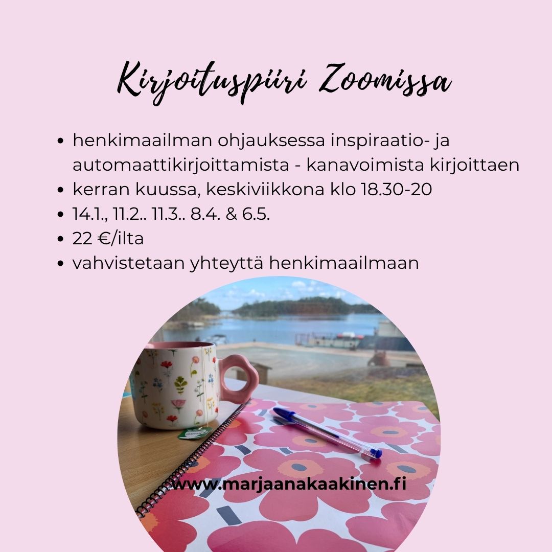 Kirjoitus-piiri Zoomissa - ke 14.1.2026 klo 18.30-20 - ke 11.2. klo 18.30-20 - ke 11.3. klo 18.30-20 - ke 8.4. klo 18.30-20 - ke 6.5. klo 18.30-20