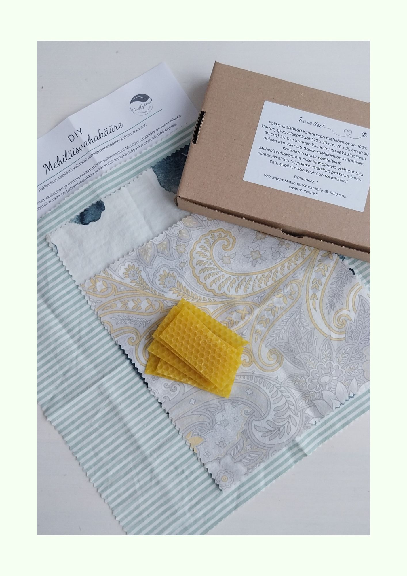 Pakkauksen sisältö: - Kirjallinen valmistusohje - 100% kierrätyspuuvillakankaat Art by Mummin ylijäämäkankaista, leikattu valmiiksi kolmeen kokoon: 20 x 20 cm, 20 x 25 cm ja 30 x 30 cm. - kotimainen luomu mehiläisvaha 36 g