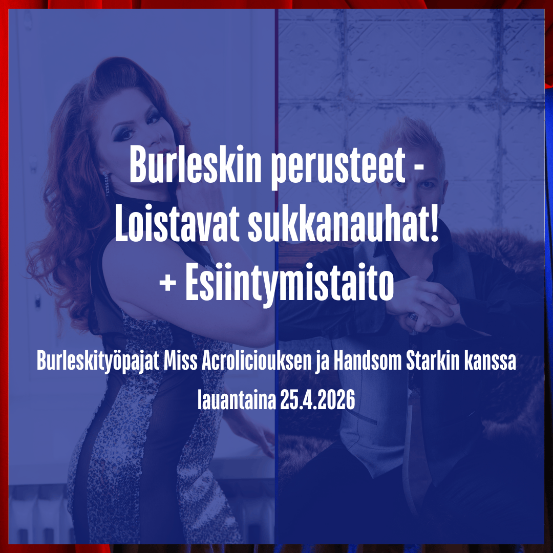 Burleskityöpajat Miss Acroliciouksen ja Handsom Starkin kanssa lauantaina 25.4.2026 klo 11.00-14.00 Keskuskentän musiikkiliikuntasalilla, Poromiehentie 4, 96100 Rovaniemi Sisäänkäynti Poromiehentien puolelta mustasta rautaportista alas kellarikerrokseen Ikäraja: 18 vuotta Ilmoittaudu ja suorita osallistumismaksu ennakkoon maksamalla osallistumismaksu Holvi-verkkokaupassa. Ilmoittautuminen on avoinna 22.4.2026 saakka tai niin kauan kuin paikkoja riittää.