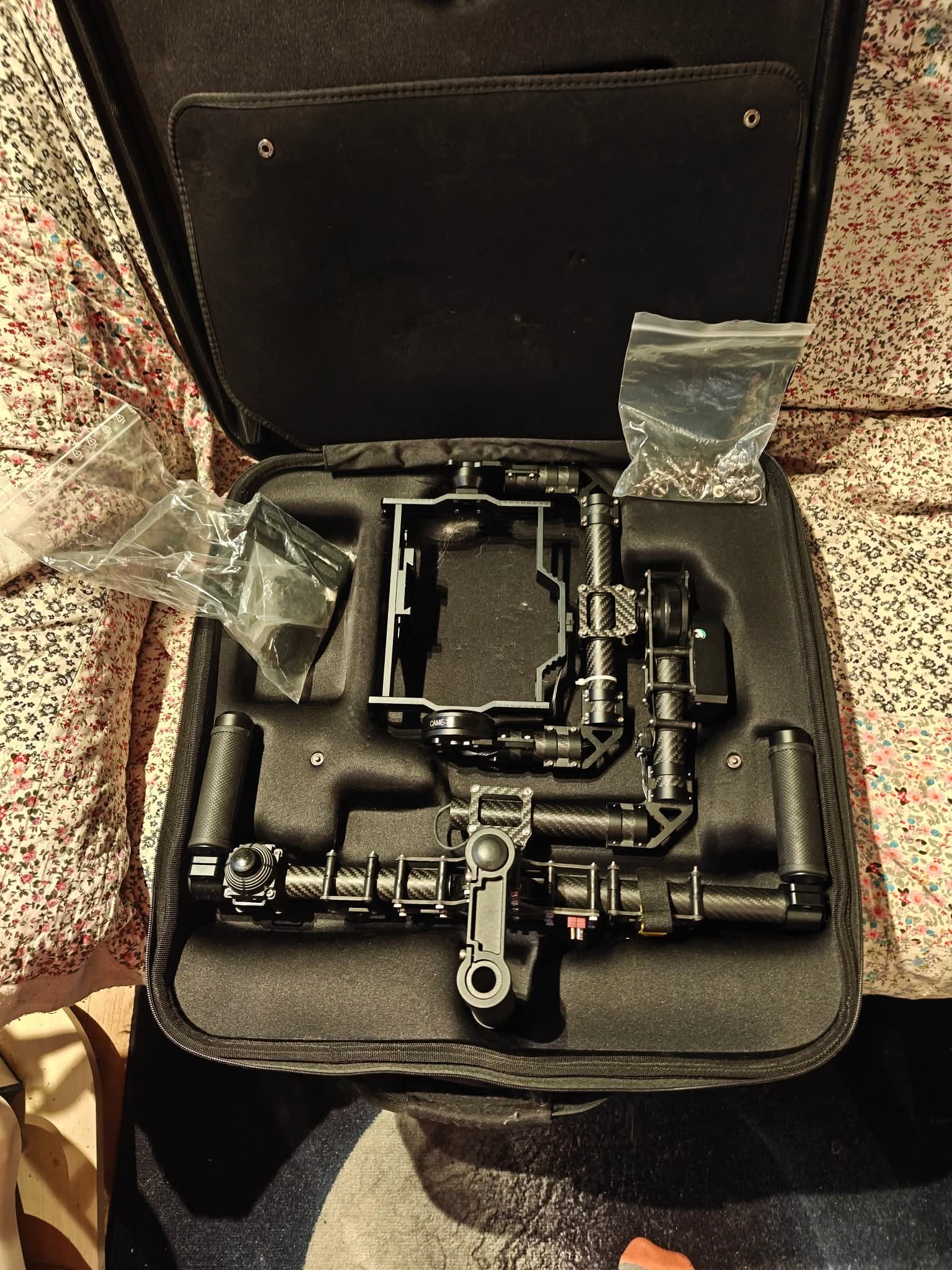Mukana läjä varaosia, akku, laturi, itse gimbal, sen teline.