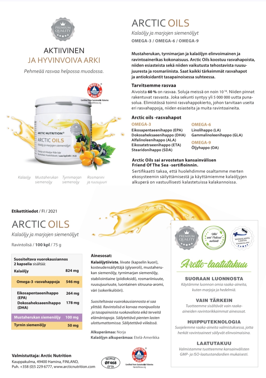 Arctic Oilsilla on arvostettu kansainvälinen Friend Of The Sea -sertifikaatti Sertifikaatti takaa, että on huolehdittu osaltaan merten ekosysteemin säilyttämisestä ja käyttämien kalaöljyn alkuperä on vastuullisesti kalastetuissa kalakannoissa.