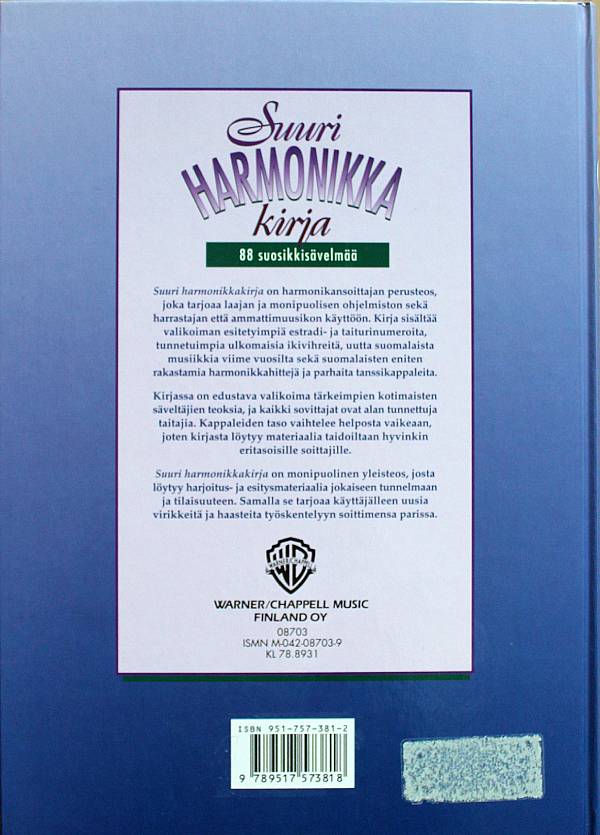 Harmonikansoittajien perusteos, joka tarjoaa laajan ja monipuolisen ohjelmiston sekä harrastajan että ammattimuusikon käyttöön. Kirja sisältää valikoiman esitetyimpiä estradi- ja taiturinumeroita, tunnetuimpia ulkomaisia ikivihreitä, uutta suomalaista musiikkia sekä suomalaisten eniten rakastamia harmonikkahittejä ja parhaita tanssikappaleita.