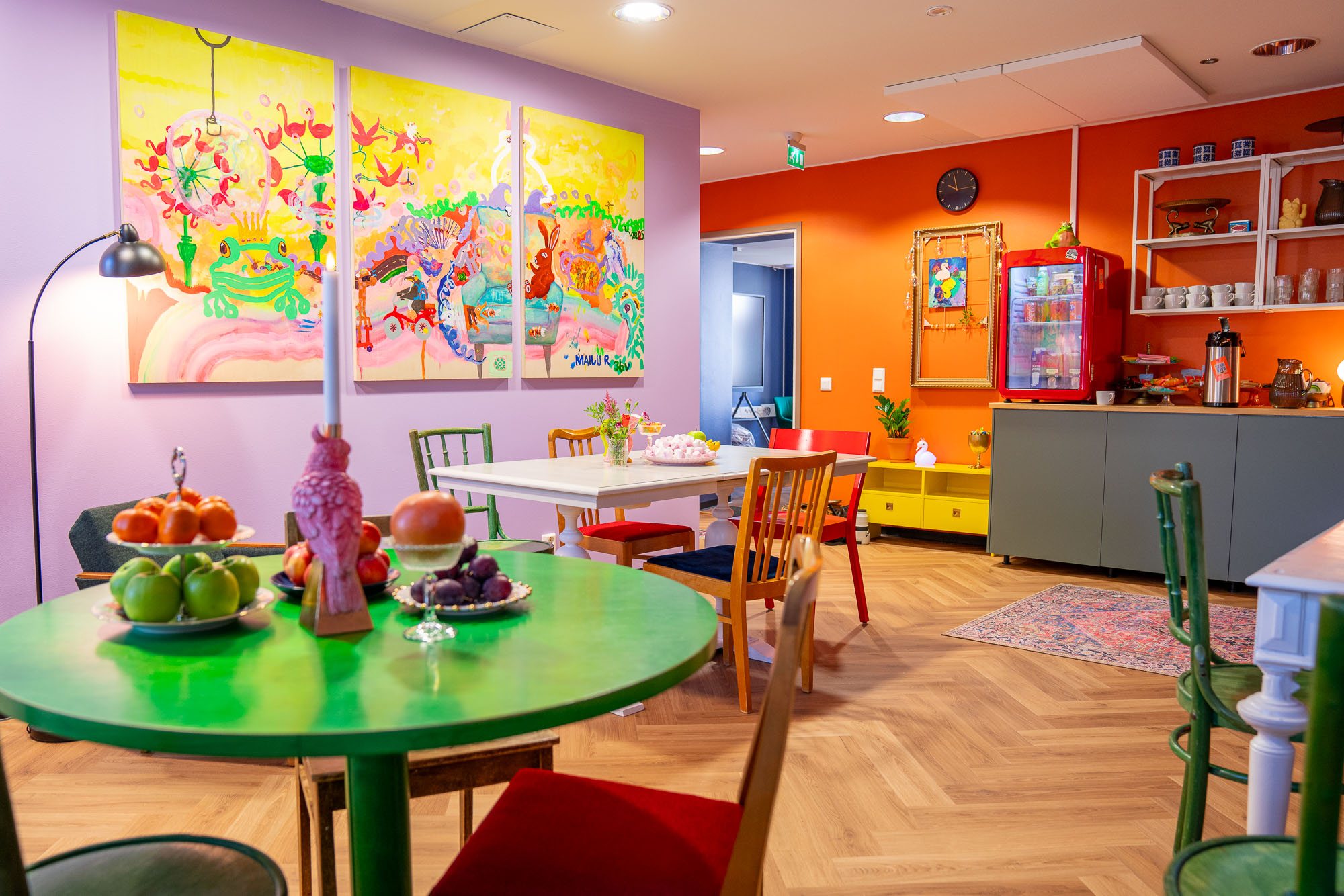 Aamupalalla on tarjolla; 🦩 Hapanjuurisämpylät; ruskistettu ja vaahdotettu voi, salaatti, kananmuna, juusto, kurkku, tomaatti 🦄 Luonnonjugurttia kotitekoisella hillolla ja Ofision omalla pähkinägranolalla 💕 Hedelmälajitelma 👄 Mustikkapiirakka ja vaniljamousse 🌸 Vitamiinishotti 🍧Tuoremehu 🦑 Lykke-kahvitilojen herkullinen kahvi ja tee