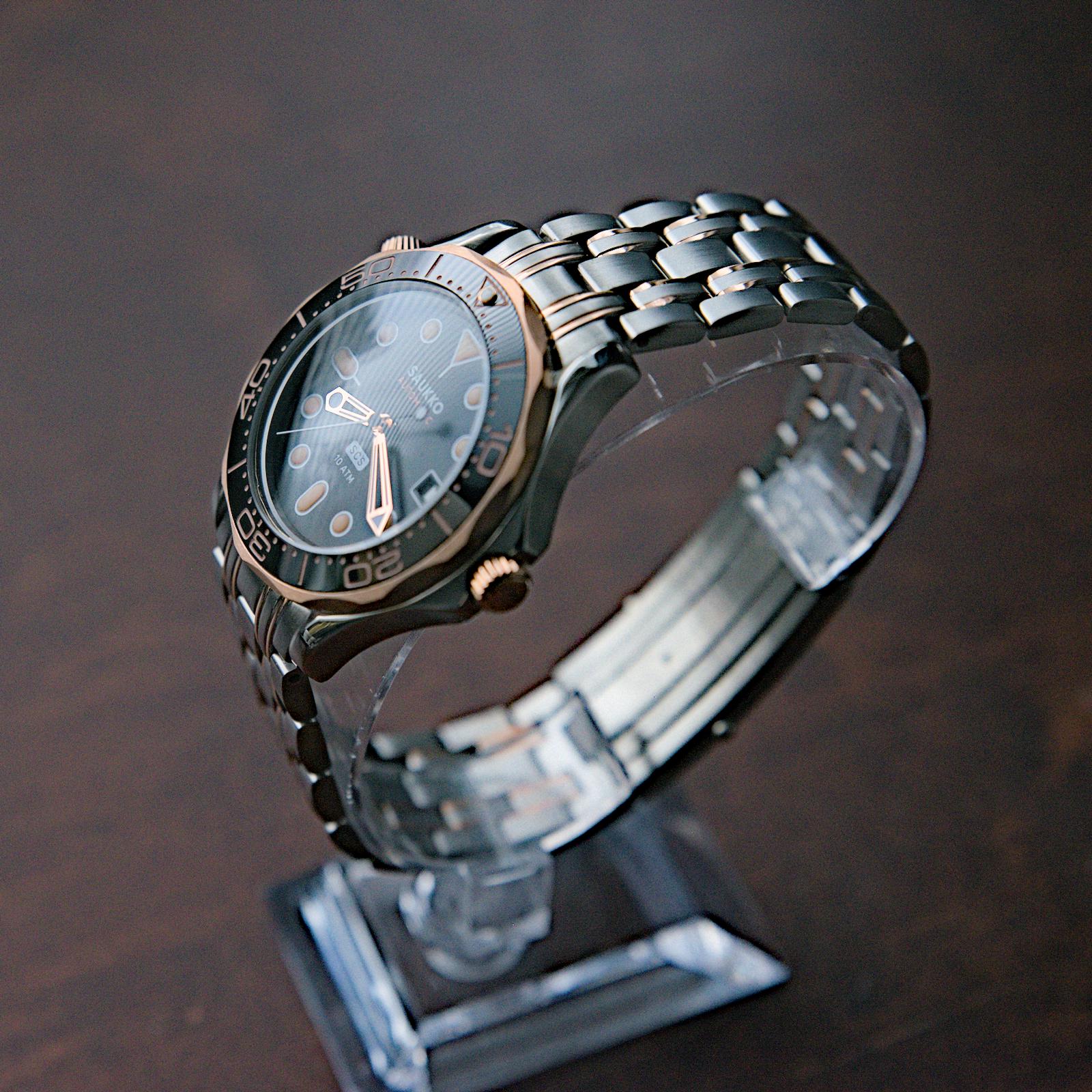 Two-tone SM300 -koteloon rakennettu astetta hienompi rannekello, jonka nimeksi tuli Hammerhead. Tyypillisiin Seamaster-kelloihin verrattuna tämä kokonaisuus nojaa utilitääriseen suuntaan, ruusukultaisista korostuksistaan huolimatta, kiitos SKX-tyyppisen sukelluskellotaulun sekä sekuntiviisarin. Tämä aikarauta sopinee siis hyvin monenlaisiin tilanteisiin.