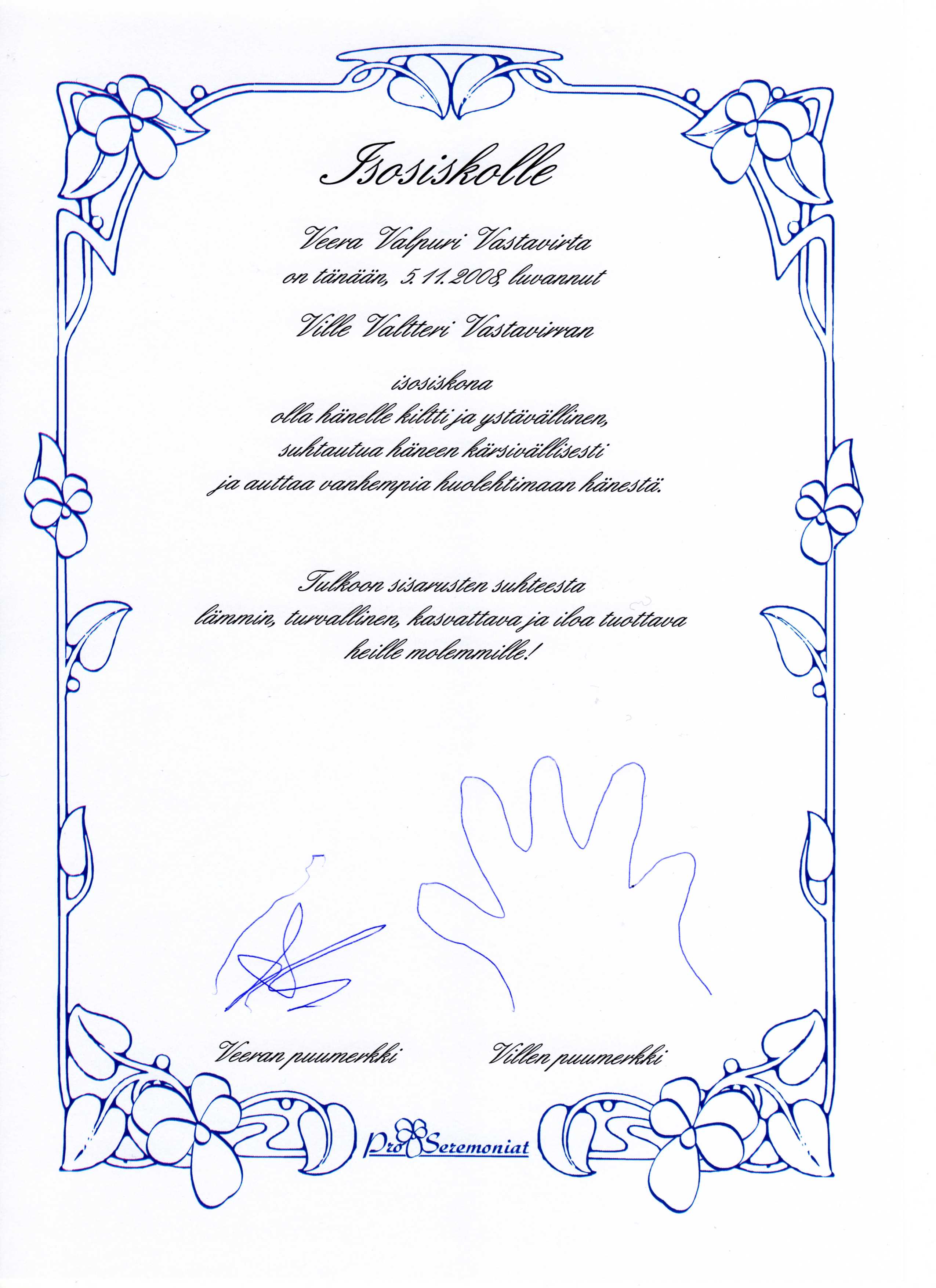 Todistukseen tulee sekä vauvan puumerkki että isosisarukselta joko puumerkki tai allekirjoitus, sen mukaan osaako hän jo kirjoittaa nimensä. (Jos taas isosisarus on jo aikuinen, käytetään toisenlaista todistustekstipohjaa.)