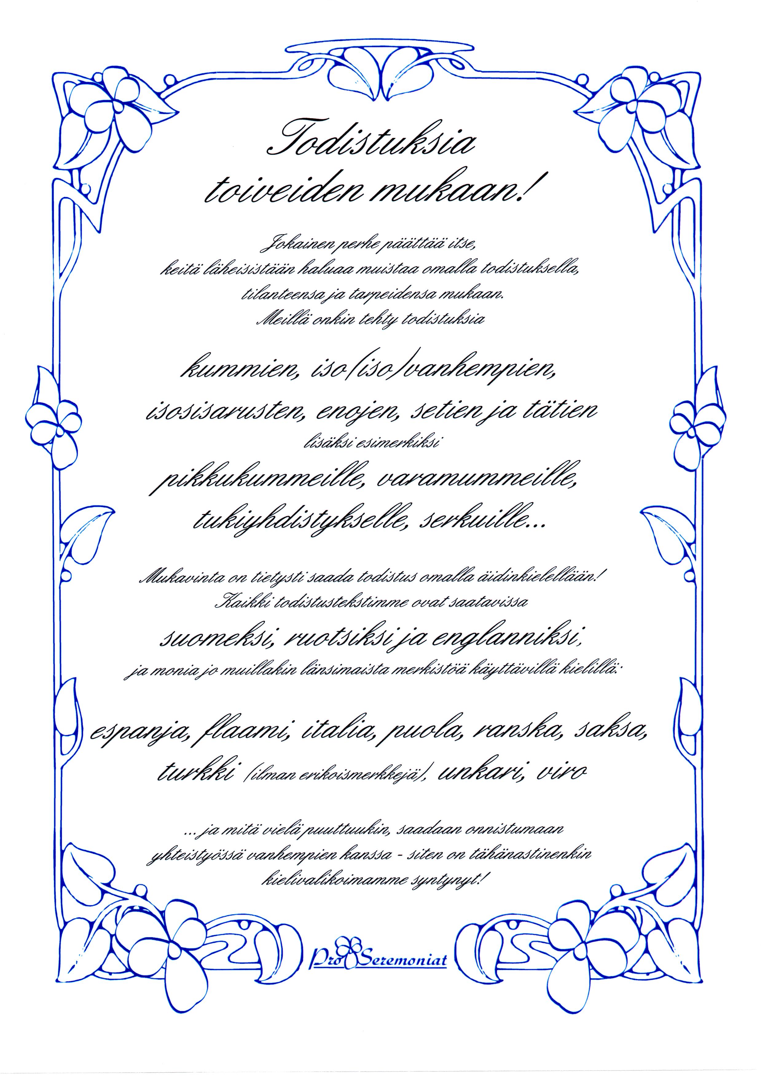 Jokainen perhe päättää itse, keitä läheisistään haluaa muistaa kirjallisesti; todistuksia on tähän mennessä tehty edellä jo mainittujen lisäksi esimerkiksi varamummeille, serkuille, tukiyhdistykselle, perhekunnittain koko juhlaväelle… Todistusten tekstit voidaan laatia joko oman ehdotuksemme tai tilaajan luonnoksen pohjalta, joka tapauksessa siis yhteistyössä tilaajan kanssa ja oikeakielisyyden, käytettävissä olevan tilan sekä Pro-Seremonioiden sekulaarihumanistisen toimintaperiaatteen asettamissa rajoissa.