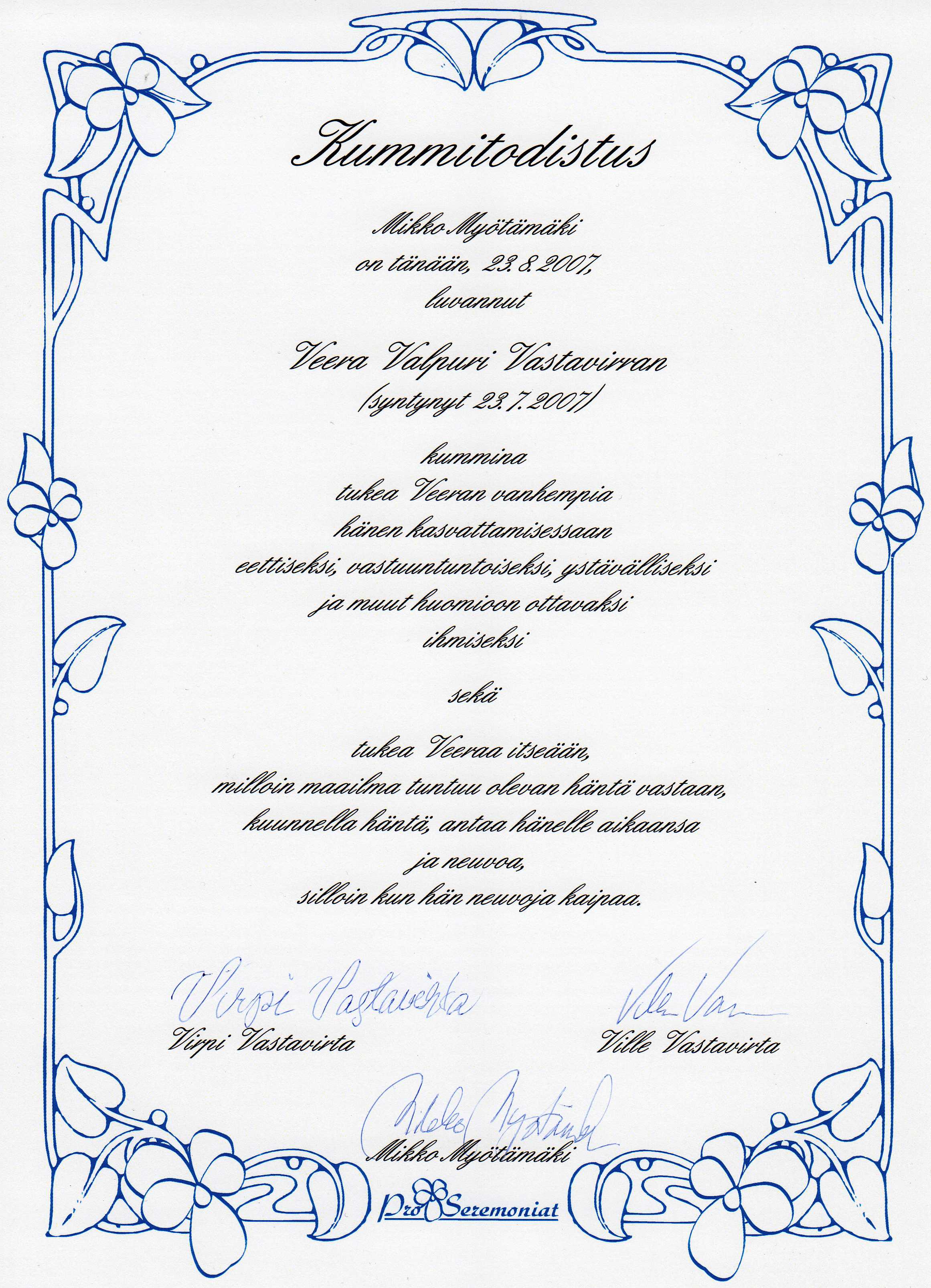 Lisäkummitodistus täydentää nimenantopaketteja silloin kun kummeja tai kummipariskuntia on yli 6. Mikäli haluat vain kummitodistukset löydät ne erillisten todistusten valikoimasta.