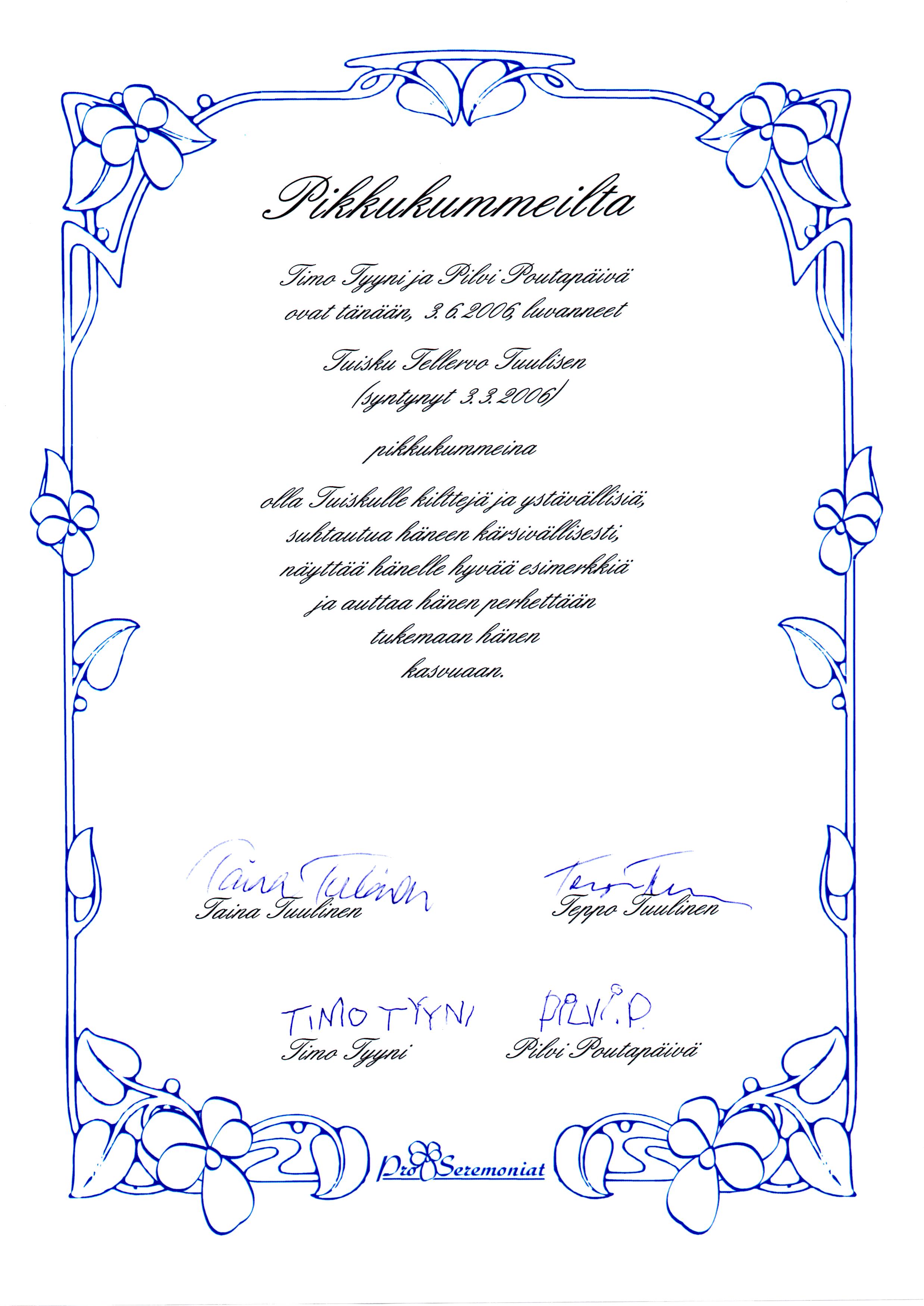 Pikkukummin todistuksesta tehdään lapselle oma kappale, jossa on kaikkien pikkukummien nimet ja allekirjoitukset. Nimet tulevat todistustekstiin tilaajan antamassa järjestyksessä.