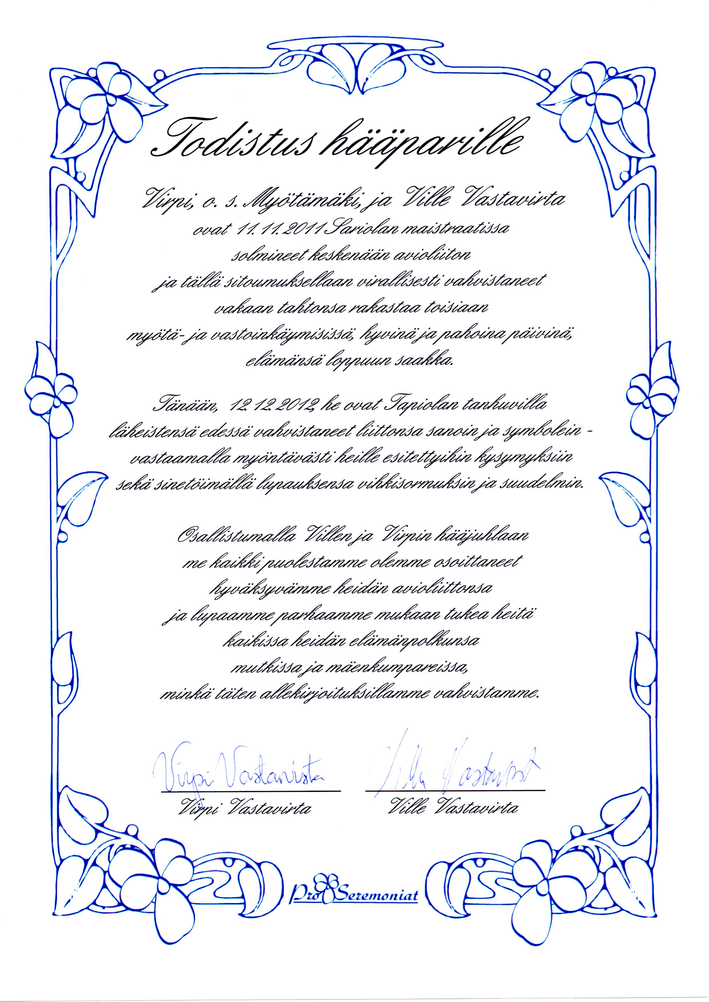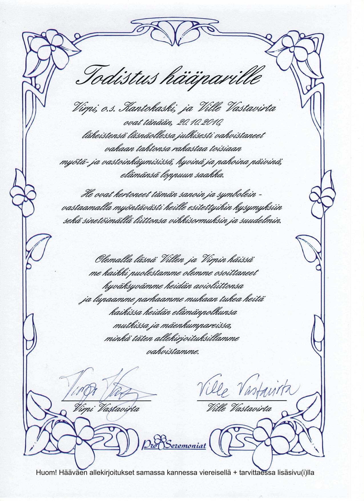 Allekirjoituksin vahvistettu todistus jää juhlavana muistuttamaan annetusta lupauksesta. Samalla se toimii niin haluttaessa myös vieraskirjana, sillä toiselle sivulle kerätään koko hääväen allekirjoitukset, joten todistus on kaksisivuinen (Huom! Alle 10 hengen häissä todistus voidaan tehdä 1-sivuisena, jolloin sekä morsiusparin että juhlavieraiden allekirjoitukset mahtuvat samalle sivulle.