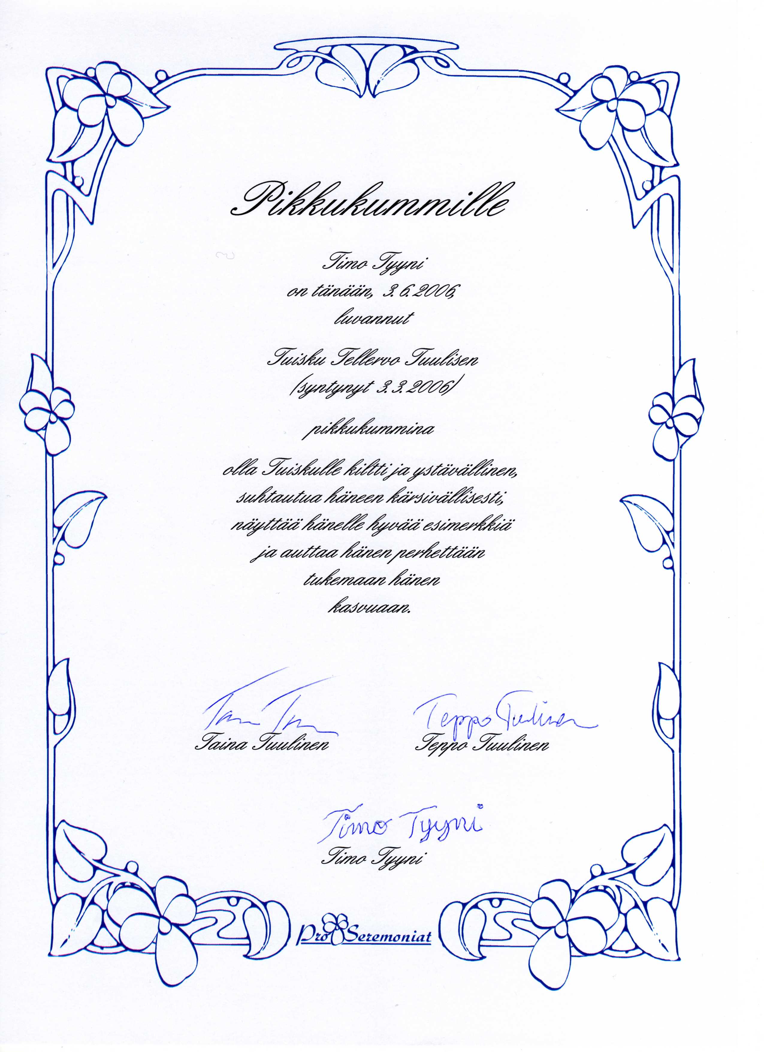 Silloin kun lapsen elämään halutaan erityinen paikka nuorelle ystävälle, voidaan hänet pyytää pikkukummiksi. Pikkukummin todistusteksti soveltuu alle 12-13-vuotiaalle saajalle paremmin kuin aikuisen kummin todistusteksti.